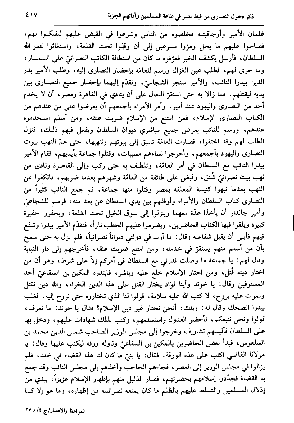 غلمان الأمير وأوجاقيته فخلصوه من الناس وشرعوا في القبض عليهم ليفتكوا بهم، فصاحوا عليهم ما يحل ومرّوا مسرعين إلى أن وقفوا تحت القلعة، واستغاثوا نصر الله السلطان، فأرسل يكشف الخبر فعرّفوه ما كان من استطالة الكاتب النصرانيّ على السمسار، وما جرى لهم، فطلب عين الغزال ورسم للعامّة بإحضار النصارى إليه، وطلب الأمير بدر الدين بيدرا النائب، والأمير سنجر الشجاعيّ، وتقدّم إليهما بإحضار جميع النصارى بين يديه ليقتلهم، فما زالا به حتى استقرّ الحال على أن ينادي في القاهرة ومصر، أن لا يخدم أحد من النصارى واليهود عند الأمير، وأمر الأمراء بأجمعهم أن يعرضوا على من عندهم من الكتاب النصارى الإسلام، فمن امتنع من الإسلام ضربت عنقه، ومن أسلم استخدموه عندهم، ورسم للنائب بعرض جميع مباشري ديوان السلطان ويفعل فيهم ذلك، فنزل الطلب لهم وقد اختفوا، فصارت العامّة تسبق إلى بيوتهم وتنهبها، حتى عمّ النهب بيوت النصارى واليهود بأجمعهم، وأخرجوا نساءهم مسبيات، وقتلوا جماعة بأيديهم، فقام الأمير بيدرا النائب مع السلطان في أمر العامّة، وتلطف به حتى ركب وإلى القاهرة ونادى من نهب بيت نصرانيّ شنق، وقبض على طائفة من العامّة وشهرهم بعد ما ضربهم، فانكفوا عن النهب بعد ما نبهوا كنيسة المعلقة بمصر وقتلوا منها جماعة، ثم جمع النائب كثيرا من النصارى كتاب السلطان والأمراء وأوقفهم بين يدي السلطان عن بعد منه، فرسم للشجاعيّ وأمير جاندار أن يأخذا عدّة معهما وينزلوا إلى سوق الخيل تحت القلعة، ويحفروا حفيرة كبيرة ويلقوا فيها الكتاب الحاضرين، ويضرموا عليهم الحطب نارا، فتقدّم الأمير بيدرا وشفع فيهم فأبى أن يقبل شفاعته وقال: ما أريد في دولتي ديوانا نصرانيا، فلم يزل به حتى سمح بأن من أسلم منهم يستقرّ في خدمته، ومن امتنع ضربت عنقه، فأخرجهم إلى دار النيابة وقال لهم: يا جماعة ما وصلت قدرتي مع السلطان في أمركم إلّا على شرط، وهو أن من اختار دينه قتل، ومن اختار الإسلام خلع عليه وباشر، فابتدره المكين بن السقاعيّ أحد المستوفين وقال: يا خوند وأينا قوّاد يختار القتل على هذا الدين الخراء، والله دين نقتل ونموت عليه يروح، لا كتب الله عليه سلامة، قولوا لنا الذي تختاروه حتى نروح إليه، فغلب بيدرا الضحك وقال له: ويلك، أنحن نختار غير دين الإسلام؟ فقال يا خوند: ما نعرف، قولوا ونحن نتبعكم، فأحضر العدول واستسلمهم، وكتب بذلك شهادات عليهم، ودخل بها على السلطان فألبسهم تشاريف وخرجوا إلى مجلس الوزير الصاحب شمس الدين محمد بن السلعوس، فبدأ بعض الحاضرين بالمكين بن السقاعيّ وناوله ورقة ليكتب عليها وقال: يا مولانا القاضي اكتب على هذه الورقة. فقال: يا بنيّ ما كان لنا هذا القضاء في خلد، فلم يزالوا في مجلس الوزير إلى العصر، فجاءهم الحاجب وأخذهم إلى مجلس النائب وقد جمع به القضاة فجدّدوا إسلامهم بحضرتهم، فصار الذليل منهم بإظهار الإسلام عزيزا، يبدي من إذلال المسلمين والتسلط عليهم بالظلم ما كان يمنعه نصرانيته من إظهاره، وما هو إلا كما