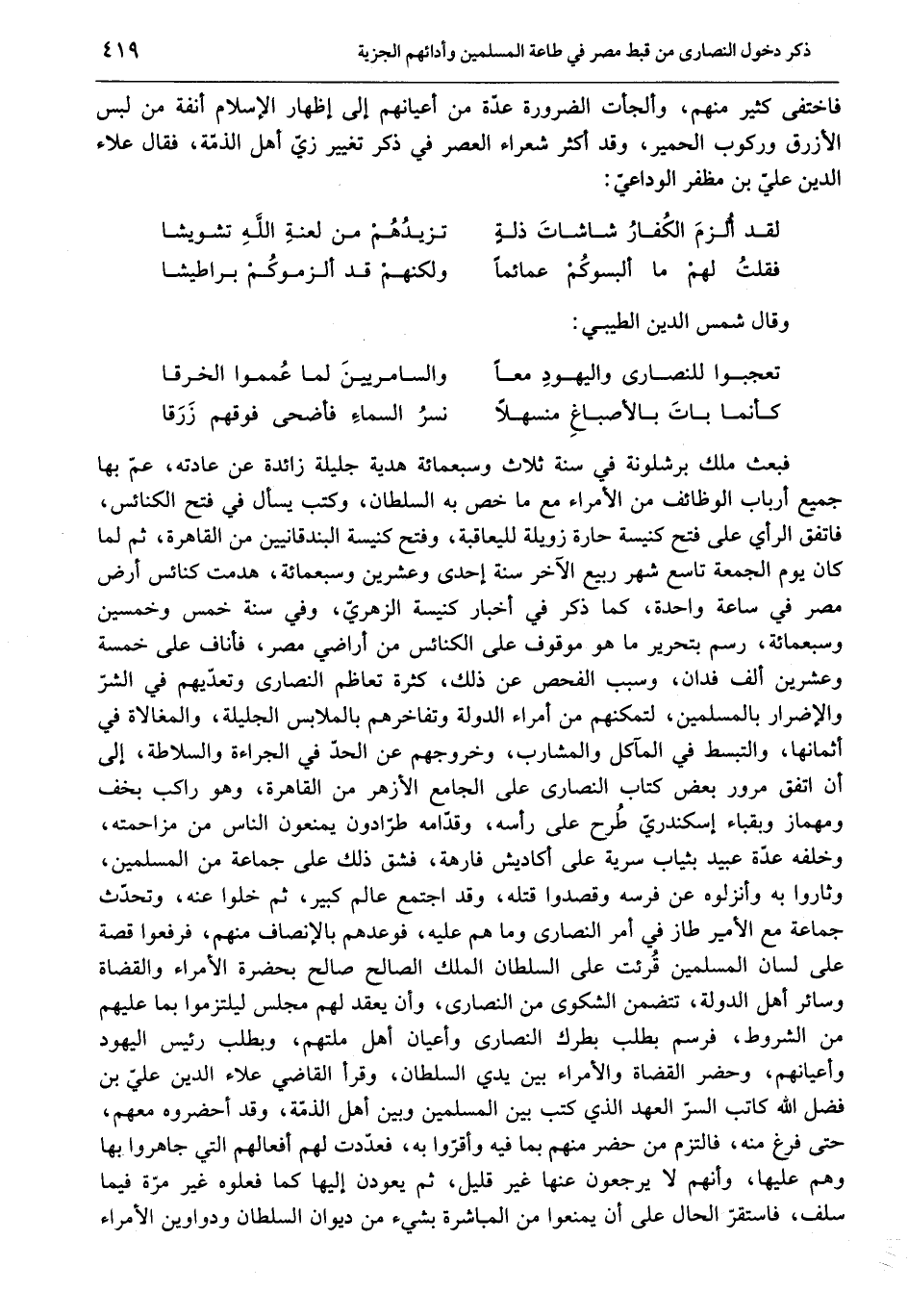 فاختفى كثير منهم، وألجأت الضرورة عدّة من أعيانهم إلى إظهار الإسلام أنفة من لبس الأزرق وركوب الحمير، وقد أكثر شعراء العصر في ذكر تغيير زيّ أهل الذمّة، فقال علاء الدين عليّ بن مظفر الوداعيّ: