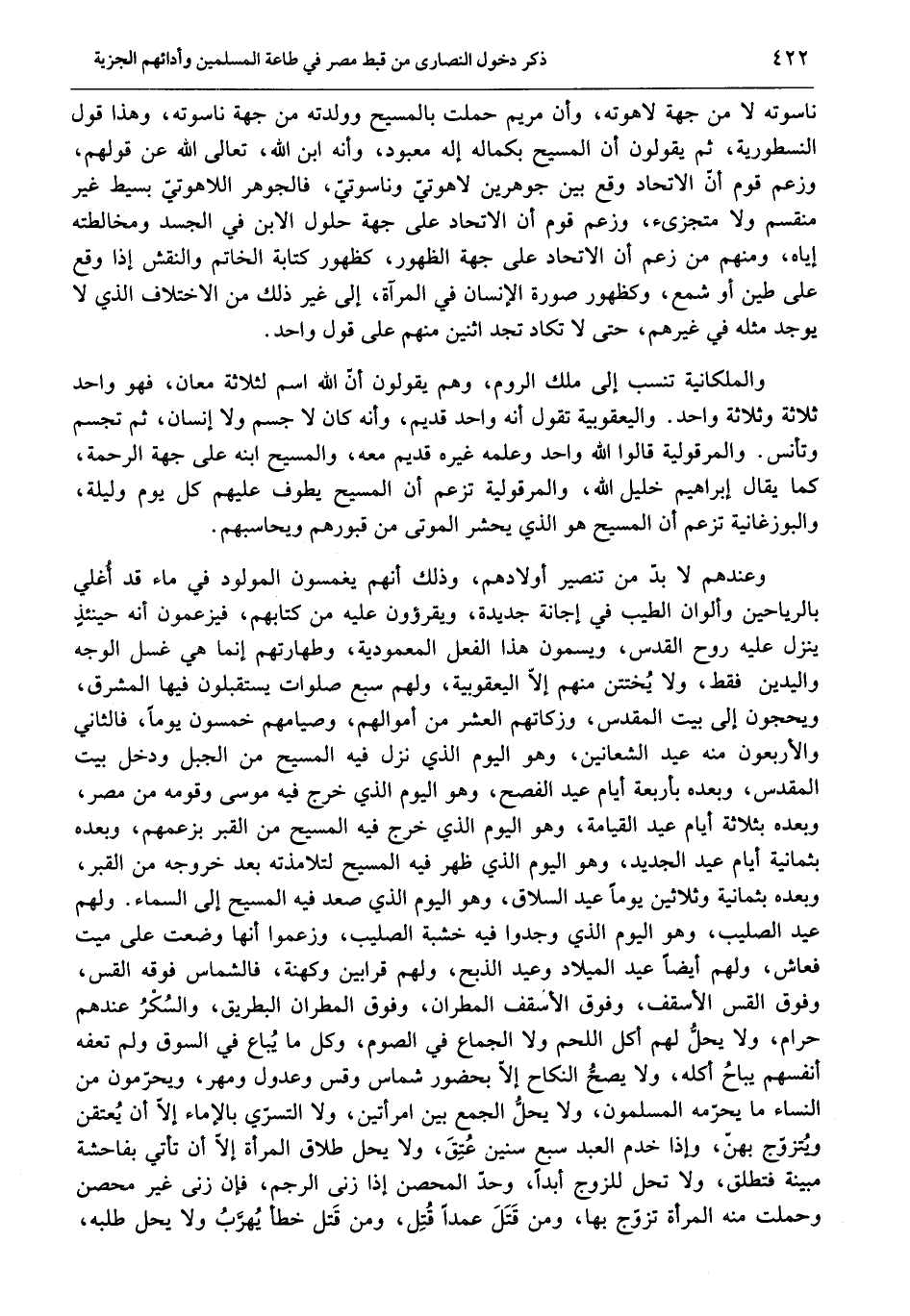 وعندهم لا بدّ من تنصير أولادهم، وذلك أنهم يغمسون المولود في ماء قد أغلي بالرياحين وألوان الطيب في إجانة جديدة، ويقرءون عليه من كتابهم، فيزعمون أنه حينئذ ينزل عليه روح القدس، ويسمون هذا الفعل المعمودية، وطهارتهم إنما هي غسل الوجه واليدين فقط، ولا يختتن منهم إلّا اليعقوبية، ولهم سبع صلوات يستقبلون فيها المشرق، ويحجون إلى بيت المقدس، وزكاتهم العشر من أموالهم، وصيامهم خمسون يوما، فالثاني والأربعون منه عيد الشعانين، وهو اليوم الذي نزل فيه المسيح من الجبل ودخل بيت المقدس، وبعده بأربعة أيام عيد الفصح، وهو اليوم الذي خرج فيه موسى وقومه من مصر، وبعده بثلاثة أيام عيد القيامة، وهو اليوم الذي خرج فيه المسيح من القبر بزعمهم، وبعده بثمانية أيام عيد الجديد، وهو اليوم الذي ظهر فيه المسيح لتلامذته بعد خروجه من القبر، وبعده بثمانية وثلاثين يوما عيد السلاق، وهو اليوم الذي صعد فيه المسيح إلى السماء. ولهم عيد الصليب، وهو اليوم الذي وجدوا فيه خشية الصليب، وزعموا أنها وضعت على ميت فعاش، ولهم أيضا عيد الميلاد وعيد الذبح، ولهم قرابين وكهنة، فالشماس فوقه القس، وفوق القس الأسقف، وفوق الأسقف المطران، وفوق المطران البطريق، والسكر عندهم حرام، ولا يحلّ لهم أكل اللحم ولا الجماع في الصوم، وكل ما يباع في السوق ولم تعفه أنفسهم يباح أكله، ولا يصحّ النكاح إلّا بحضور شماس وقس وعدول ومهر، ويحرّمون من النساء ما يحرّمه المسلمون، ولا يحلّ الجمع بين امرأتين، ولا التسرّي بالإماء إلّا أن يعتقن ويتزوّج بهنّ، وإذا خدم العبد سبع سنين عتق، ولا يحل طلاق المرأة إلّا أن تأتي بفاحشة مبينة فتطلق، ولا تحل للزوج أبدا، وحدّ المحصن إذا زنى الرجم، فإن زنى غير محصن وحملت منه المرأة تزوّج بها، ومن قتل عمدا قتل، ومن قتل خطأ يهرّب ولا يحل طلبه،