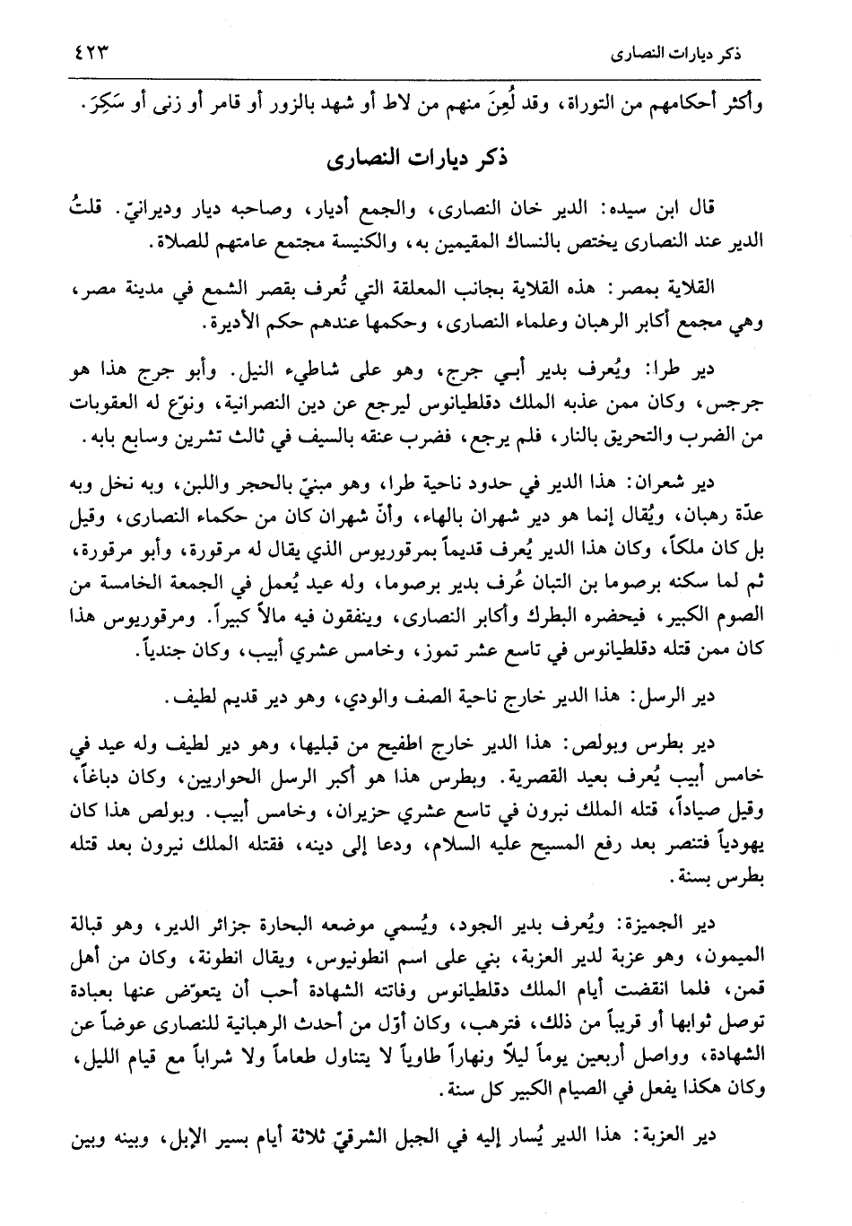 دير العزبة: هذا الدير يسار إليه في الجبل الشرقيّ ثلاثة أيام بسير الإبل، وبينه وبين