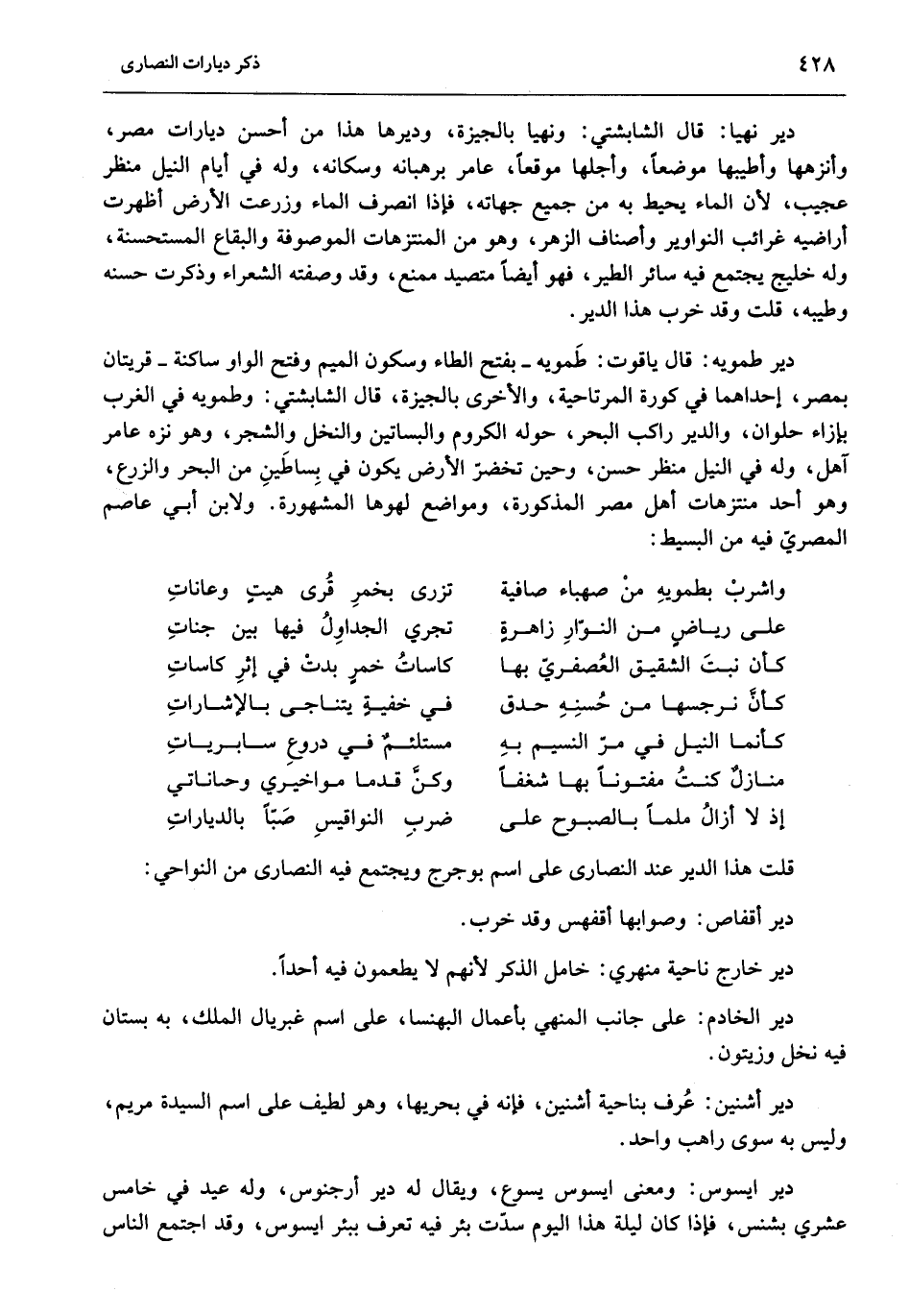 دير طمويه: قال ياقوت: طمويه- بفتح الطاء وسكون الميم وفتح الواو ساكنة- قريتان بمصر، إحداهما في كورة المرتاحية، والأخرى بالجيزة، قال الشابشتي: وطمويه في الغرب بإزاء حلوان، والدير راكب البحر، حوله الكروم والبساتين والنخل والشجر، وهو نزه عامر آهل، وله في النيل منظر حسن، وحين تخضرّ الأرض يكون في بساطين من البحر والزرع، وهو أحد منتزهات أهل مصر المذكورة، ومواضع لهوها المشهورة. ولابن أبي عاصم المصريّ فيه من البسيط: