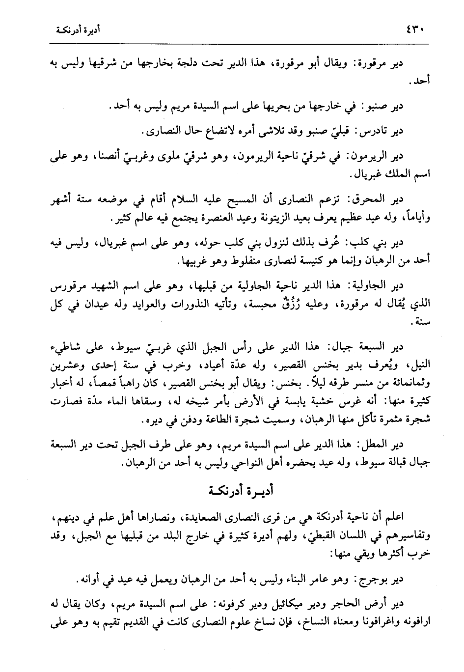 اعلم أن ناحية أدرنكة هي من قرى النصارى الصعايدة، ونصاراها أهل علم في دينهم، وتفاسيرهم في اللسان القبطيّ، ولهم أديرة كثيرة في خارج البلد من قبليها مع الجبل، وقد خرب أكثرها وبقي منها: