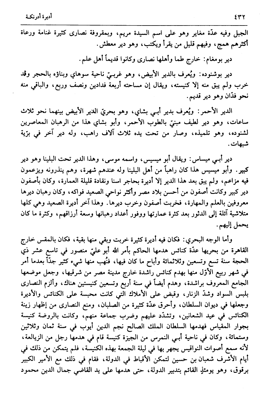 الوجه البحري: فكان فيه أديرة كثيرة خربت وبقي منها بقية، فكان بالمقس خارج القاهرة من بحريها عدّة كنائس هدمها الحاكم بأمر الله أبو عليّ منصور في تاسع عشر ذي الحجة سنة تسع وتسعين وثلاثمائة وأباح ما كان فيها، فنهب منها شيء كثير جدّا بعد ما أمر في شهر ربيع الأوّل منها بهدم كنائس راشدة خارج مدينة مصر من شرقيها، وجعل موضعها الجامع المعروف براشدة، وهدم أيضا في سنة أربع وتسعين كنيستين هناك، وألزم النصارى بلبس السواد وشدّ الزنار، وقبض على الأملاك التي كانت محبسة على الكنائس والأديرة وجعلها في ديوان السلطان، وأحرق عدّة كثيرة من الصلبان، ومنع النصارى من إظهار زينة الكنائس في عيد الشعانين، وتشدّد عليهم وضرب جماعة منهم، وكانت بالروضة كنيسة بجوار المقياس فهدمها السلطان الملك الصالح نجم الدين أيوب في سنة ثمان وثلاثين وستمائة، وكان في ناحية أبي النمرس من الجيزة كنيسة قام في هدمها رجل من الزيالعة، لأنه سمع أصوات النواقيس يجهر بها في ليلة الجمعة بهذه الكنيسة، فلم يتمكن من ذلك في أيام الأشرف شعبان بن حسين لتمكن الأقباط في الدولة، فقام في ذلك مع الأمير الكبير برقوق، وهو يومئذ القائم بتدبير الدولة، حتى هدمها على يد القاضي جمال الدين محمود