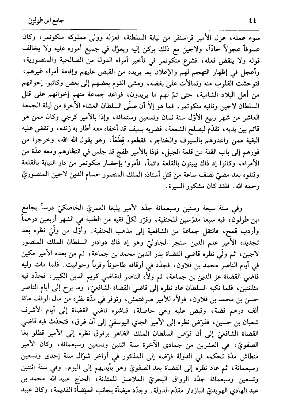 وفي سنة سبعة وستين وسبعمائة جدّد الأمير يلبغا العمريّ الخاصكيّ درسا بجامع ابن طولون، فيه سبعا مدرّسين للحنفية، وقرّر لكلّ فقيه من الطلبة في الشهر أربعين درهما وأردب قمح، فانتقل جماعة من الشافعية إلى مذهب الحنفية. وأوّل من ولّي نظره بعد تجديده الأمير علم الدين سنجر الجاوليّ وهو إذ ذاك دوادار السلطان الملك المنصور لاجين، ثم ولّي نظره قاضي القضاة بدر الدين محمد بن جماعة، ثم من بعده الأمير مكين في أيام الناصر محمد بن قلاون، فجدّد في أوقافه طاحونا وفرنا وحوانيت. فلما مات وليه قاضي القضاة عز الدين بن جماعة، ثم ولّاه الناصر للقاضي كريم الدين الكبير، فحدّد فيه مئذنتين، فلما نكبه السلطان عاد نظره إلى قاضي القضاة الشافعيّ، وما برح إلى أيام الناصر حسن بن محمد بن قلاون، فولّاه للأمير صرغتمش، وتوفر في مدّة نظره من مال الوقف مائة ألف درهم فضة، وقبض عليه وهي حاصلة، فباشره قاضي القضاة إلى أيام الأشرف شعبان بن حسين، ففوّض نظره إلى الأمير الجاي اليوسفيّ إلى أن غرق، فتحدّث فيه قاضي القضاة الشافعيّ إلى أن فوّض السلطان الملك الظاهر برقوق نظره إلى الأمير قطلو بغا الصفويّ، في العشرين من جمادى الآخرة سنة اثنتين وتسعين وسبعمائة، وكان الأمير منطاش مدّة تحكمه في الدولة فوّضه إلى المذكور في أواخر شوّال سنة إحدى وتسعين وسبعمائة، ثم عاد نظره إلى القضاة بعد الصفويّ وهو بأيديهم إلى اليوم. وفي سنة اثنتين وتسعين وسبعمائة جدّد الرواق البحريّ الملاصق للمئذنة، الحاج عبيد الله محمد بن عبد الهادي الهويديّ البازدار مقدّم الدولة. وجدّد ميضأة بجانب الميضأة القديمة، وكان عبيد