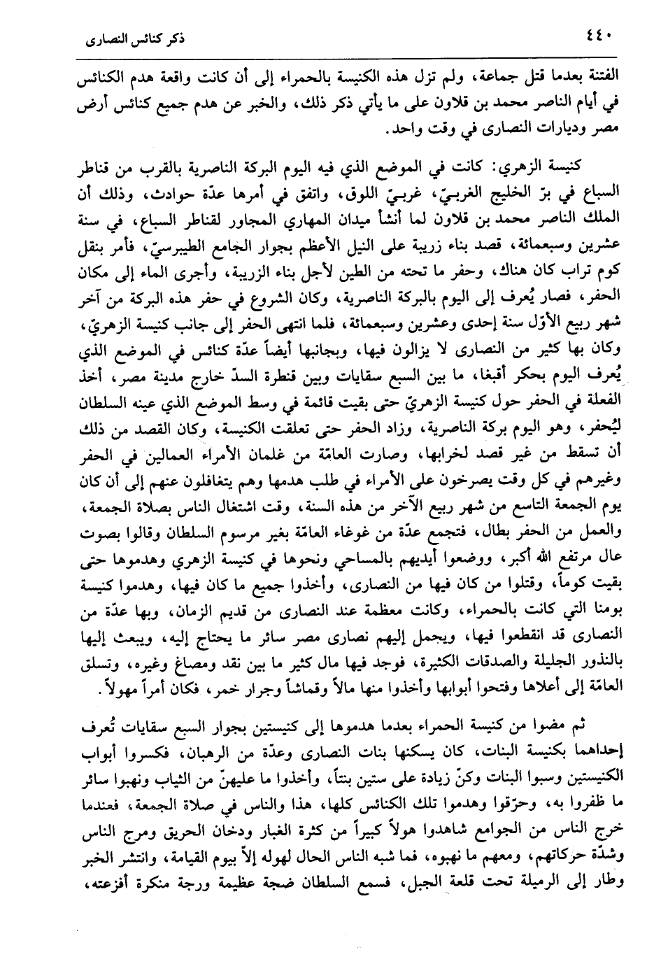 الفتنة بعد ما قتل جماعة، ولم تزل هذه الكنيسة بالحمراء إلى أن كانت واقعة هدم الكنائس في أيام الناصر محمد بن قلاون على ما يأتي ذكر ذلك، والخبر عن هدم جميع كنائس أرض مصر وديارات النصارى في وقت واحد.