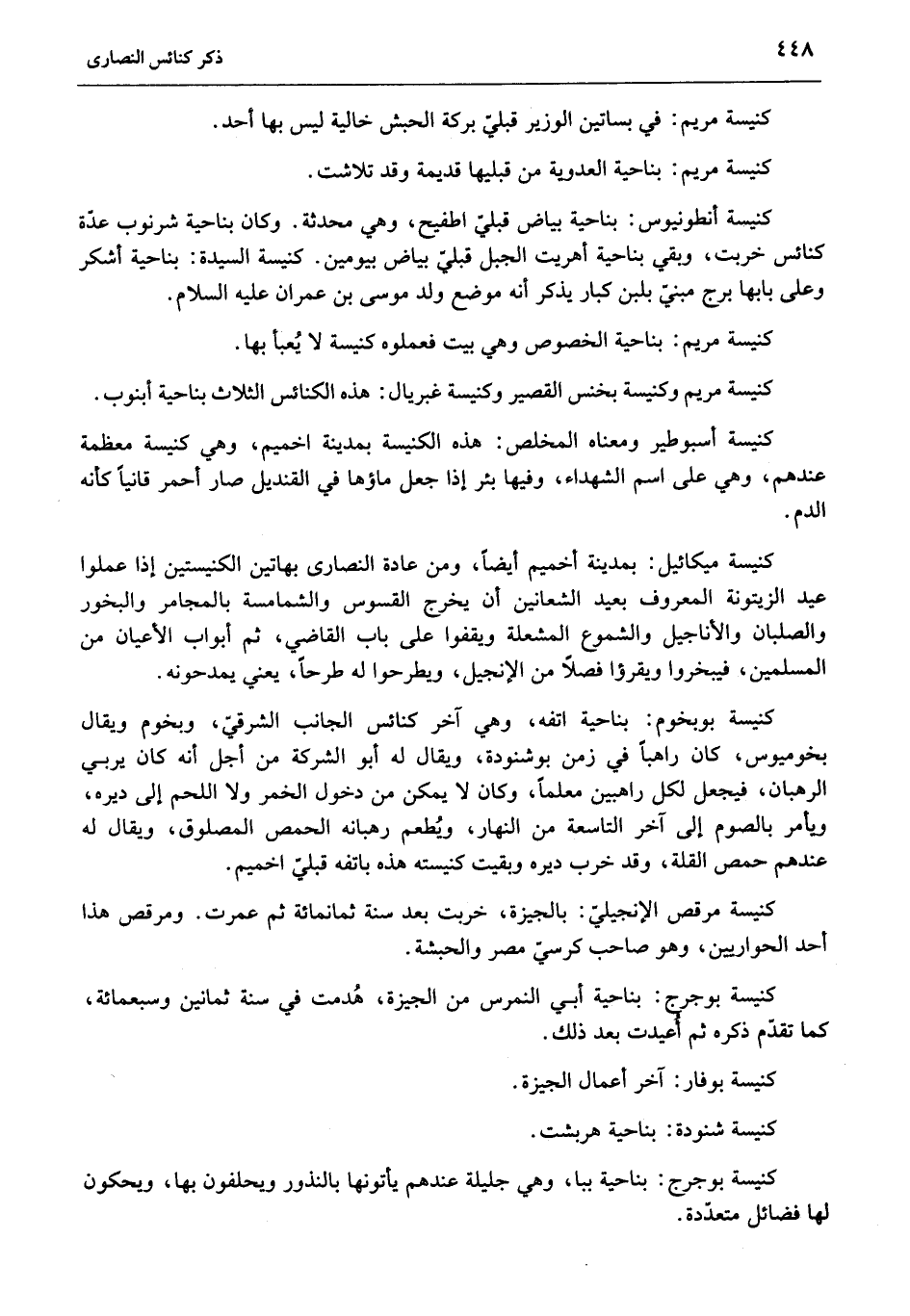كنيسة ميكائيل: بمدينة أخميم أيضا، ومن عادة النصارى بهاتين الكنيستين إذا عملوا عيد الزيتونة المعروف بعيد الشعانين أن يخرج القسوس والشمامسة بالمجامر والبخور والصلبان والأناجيل والشموع المشتعلة ويقفوا على باب القاضي، ثم أبواب الأعيان من المسلمين، فيبخروا ويقرءوا فصلا من الإنجيل، ويطرحوا له طرحا، يعني يمدحونه.