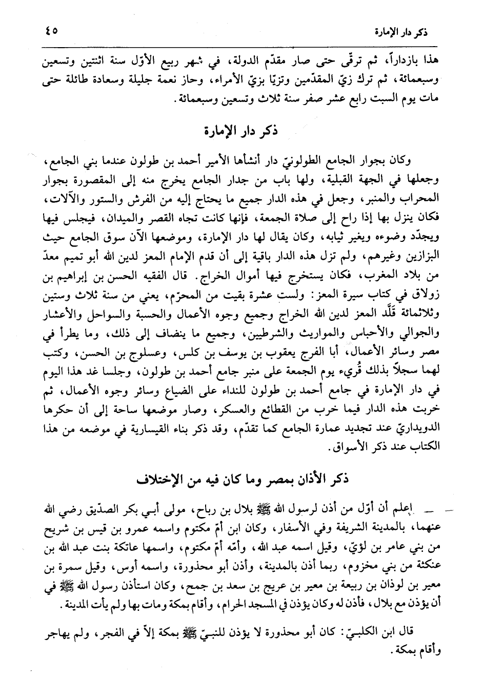 وكان بجوار الجامع الطولونيّ دار أنشأها الأمير أحمد بن طولون عندما بني الجامع، وجعلها في الجهة القبلية، ولها باب من جدار الجامع يخرج منه إلى المقصورة بجوار المحراب والمنبر، وجعل في هذه الدار جميع ما يحتاج إليه من الفرش والستور والآلات، فكان ينزل بها إذا راح إلى صلاة الجمعة، فإنها كانت تجاه القصر والميدان، فيجلس فيها ويجدّد وضوءه ويغير ثيابه، وكان يقال لها دار الإمارة، وموضعها الآن سوق الجامع حيث البزازين وغيرهم، ولم تزل هذه الدار باقية إلى أن قدم الإمام المعز لدين الله أبو تميم معدّ من بلاد المغرب، فكان يستخرج فيها أموال الخراج. قال الفقيه الحسن بن إبراهيم بن زولاق في كتاب سيرة المعز: ولست عشرة بقيت من المحرّم، يعني من سنة ثلاث وستين وثلاثمائة قلّد المعز لدين الله الخراج وجميع وجوه الأعمال والحسبة والسواحل والأعشار والجوالي والأحباس والمواريث والشرطيين، وجميع ما ينضاف إلى ذلك، وما يطرأ في مصر وسائر الأعمال، أبا الفرج يعقوب بن يوسف بن كلس، وعسلوج بن الحسن، وكتب لهما سجلا بذلك قريء يوم الجمعة على منبر جامع أحمد بن طولون، وجلسا غد هذا اليوم في دار الإمارة في جامع أحمد بن طولون للنداء على الضياع وسائر وجوه الأعمال، ثم خربت هذه الدار فيما خرب من القطائع والعسكر، وصار موضعها ساحة إلى أن حكرها الدويداريّ عند تجديد عمارة الجامع كما تقدّم، وقد ذكر بناء القيسارية في موضعه من هذا الكتاب عند ذكر الأسواق.