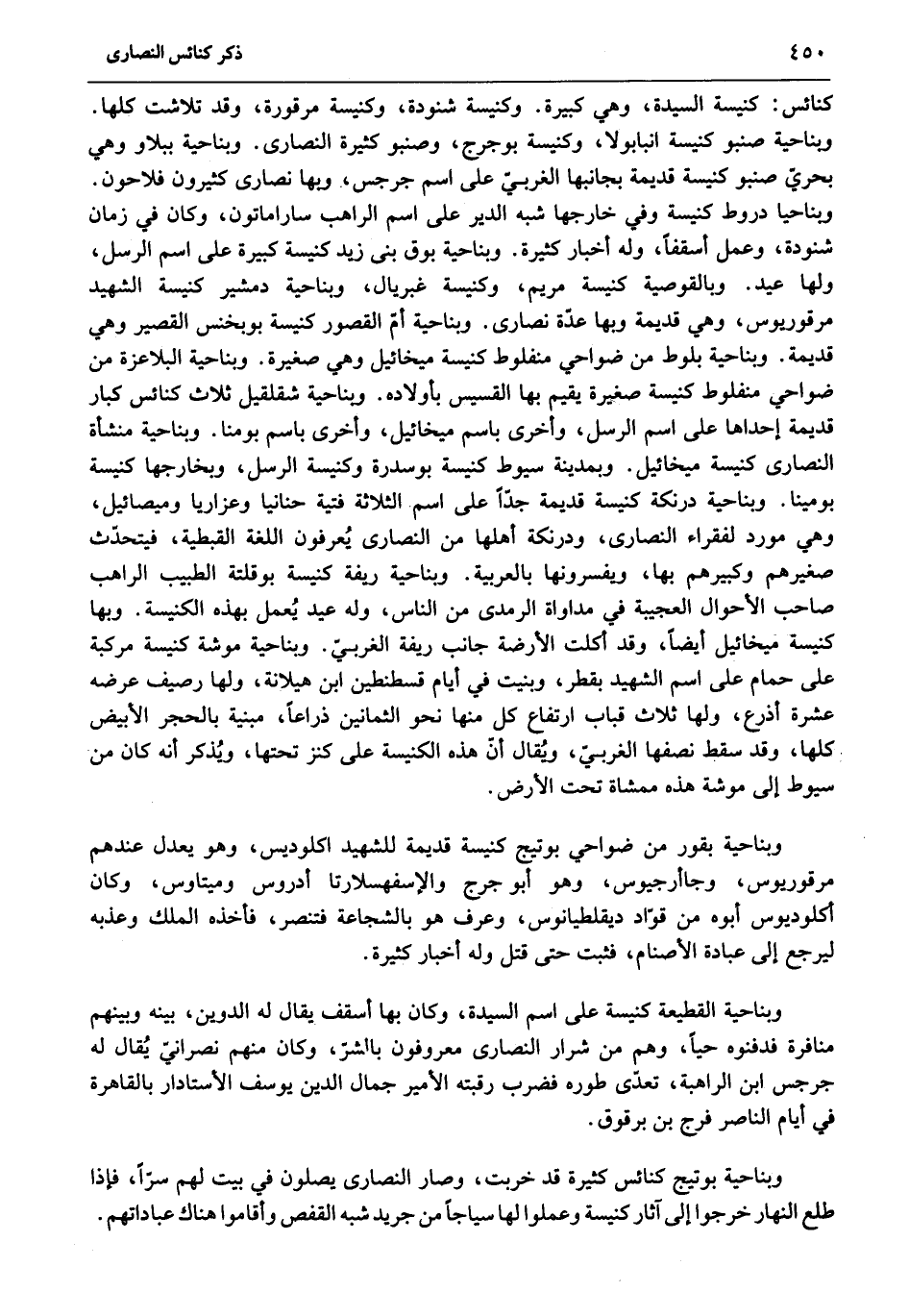 وبناحيا دروط كنيسة وفي خارجها شبه الدير على اسم الراهب ساراماتون، وكان في زمان شنودة، وعمل أسقفا، وله أخبار كثيرة. وبناحية بوق بنى زيد كنيسة كبيرة على اسم الرسل، ولها عيد. وبالقوصية كنيسة مريم، وكنيسة غبريال، وبناحية دمشير كنيسة الشهيد مرقوريوس، وهي قديمة وبها عدّة نصارى. وبناحية أمّ القصور كنيسة بوبخنس القصير وهي قديمة. وبناحية بلوط من ضواحي منفلوط كنيسة ميخائيل وهي صغيرة. وبناحية البلاعزة من ضواحي منفلوط كنيسة صغيرة يقيم بها القسيس بأولاده. وبناحية شقلقيل ثلاث كنائس كبار قديمة إحداها على اسم الرسل، وأخرى باسم ميخائيل، وأخرى باسم بومنا. وبناحية منشأة النصارى كنيسة ميخائيل. وبمدينة سيوط كنيسة بوسدرة وكنيسة الرسل، وبخارجها كنيسة بومينا. وبناحية درنكة كنيسة قديمة جدّا على اسم الثلاثة فتية حنانيا وعزاريا وميصائيل، وهي مورد لفقراء النصارى، ودرنكة أهلها من النصارى يعرفون اللغة القبطية، فيتحدّث صغيرهم وكبيرهم بها، ويفسرونها بالعربية. وبناحية ريفة كنيسة بوقلتة الطبيب الراهب صاحب الأحوال العجيبة في مداواة الرمدى من الناس، وله عيد يعمل بهذه الكنيسة. وبها كنيسة ميخائيل أيضا، وقد أكلت الأرضة جانب ريفة الغربيّ. وبناحية موشة كنيسة مركبة على حمام على اسم الشهيد بقطر، وبنيت في أيام قسطنطين ابن هيلانة، ولها رصيف عرضه عشرة أذرع، ولها ثلاث قباب ارتفاع كل منها نحو الثمانين ذراعا، مبنية بالحجر الأبيض كلها، وقد سقط نصفها الغربيّ، ويقال أنّ هذه الكنيسة على كنز تحتها، ويذكر أنه كان من سيوط إلى موشة هذه ممشاة تحت الأرض.