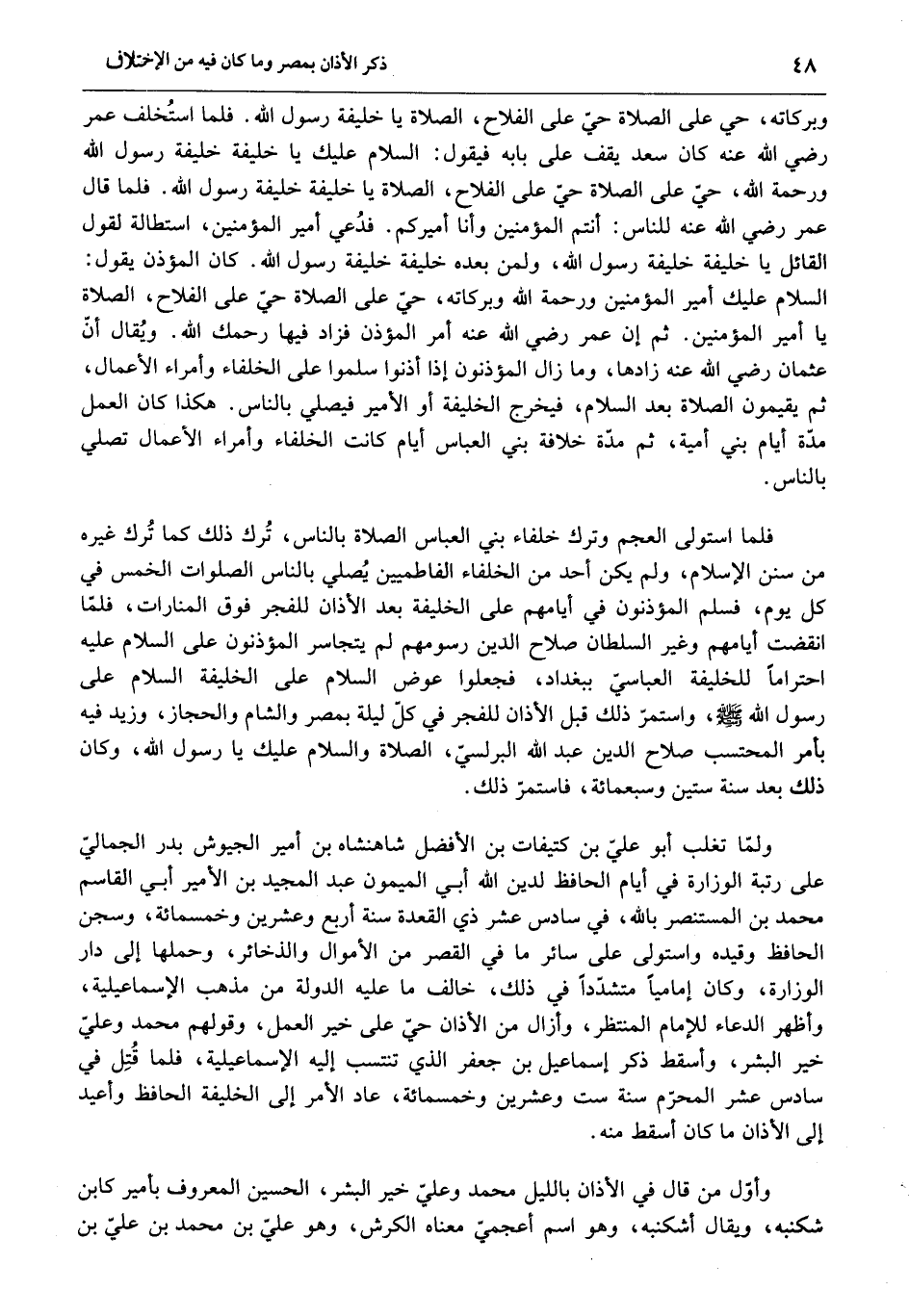 فلما استولى العجم وترك خلفاء بني العباس الصلاة بالناس، ترك ذلك كما ترك غيره من سنن الإسلام، ولم يكن أحد من الخلفاء الفاطميين يصلي بالناس الصلوات الخمس في كل يوم، فسلم المؤذنون في أيامهم على الخليفة بعد الأذان للفجر فوق المنارات، فلمّا انقضت أيامهم وغير السلطان صلاح الدين رسومهم لم يتجاسر المؤذنون على السلام عليه احتراما للخليفة العباسيّ ببغداد، فجعلوا عوض السلام على الخليفة السلام على رسول الله صلّى الله عليه وسلّم، واستمرّ ذلك قبل الأذان للفجر في كلّ ليلة بمصر والشام والحجاز، وزيد فيه بأمر المحتسب صلاح الدين عبد الله البرلسيّ، الصلاة والسلام عليك يا رسول الله، وكان ذلك بعد سنة ستين وسبعمائة، فاستمرّ ذلك.