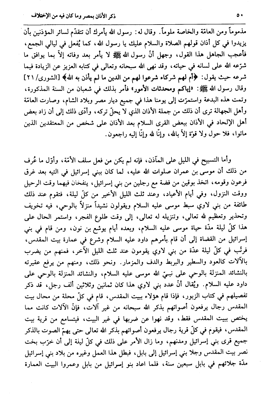 وأما التسبيح في الليل على المآذن، فإنه لم يكن من فعل سلف الأمّة، وأوّل ما عرف من ذلك أن موسى بن عمران صلوات الله عليه، لما كان ببني إسرائيل في التيه بعد غرق فرعون وقومه، اتخذ بوقين من فضة مع رجلين من بني إسرائيل، ينفخان فيهما وقت الرحيل ووقت النزول، وفي أيام الأعياد، وعند ثلث الليل الأخير من كلّ ليلة، فتقوم عند ذلك طائفة من بني لاوي سبط موسى عليه السّلام ويقولون نشيدا منزلا بالوحي، فيه تخويف وتحذير وتعظيم لله تعالى، وتنزيله له تعالى، إلى وقت طلوع الفجر، واستمر الحال على هذا كلّ ليلة مدّة حياة موسى عليه السّلام، وبعده أيام يوشع بن نون، ومن قام في بني إسرائيل من القضاة إلى أن قام بأمرهم داود عليه السّلام وشرع في عمارة بيت المقدس، فرتّب في كلّ ليلة عدّة من بني لاوي يقومون عند ثلث الليل الآخر، فمنهم من يضرب بالآلات كالعود والسطير والبربط والدف والمزمار. ونحو ذلك، ومنهم من يرفع عقيرته بالنشائد المنزلة بالوحي على نبيّ الله موسى عليه السّلام، والنشائد المنزلة بالوحي على داود عليه السّلام. ويقال أنّ عدد بني لاوي هذا كان ثمانين وثلاثين ألف رجل، قد ذكر تفصيلهم في كتاب الزبور، فإذا قام هؤلاء ببيت المقدس، قام في كلّ محلة من محال بيت المقدس رجال يرفعون أصواتهم بذكر الله سبحانه من غير آلات، فإنّ الآلات كانت مما يختص ببيت المقدس فقط، وقد نهوا عن ضربها في غير البيت، فيتسامع من قرية بيت المقدس، فيقوم في كلّ قرية رجال يرفعون أصواتهم بذكر الله تعالى حتى يهمّ الصوت بالذكر جميع قرى بني إسرائيل ومدنهم، وما زال الأمر على ذلك في كلّ ليلة إلى أن خرّب بخت نصر بيت المقدس وجلا بني إسرائيل إلى بابل، فبطل هذا العمل وغيره من بلاد بني إسرائيل مدّة جلائهم في بابل سبعين سنة، فلما اعاد بنو إسرائيل من بابل وعمروا البيت العمارة