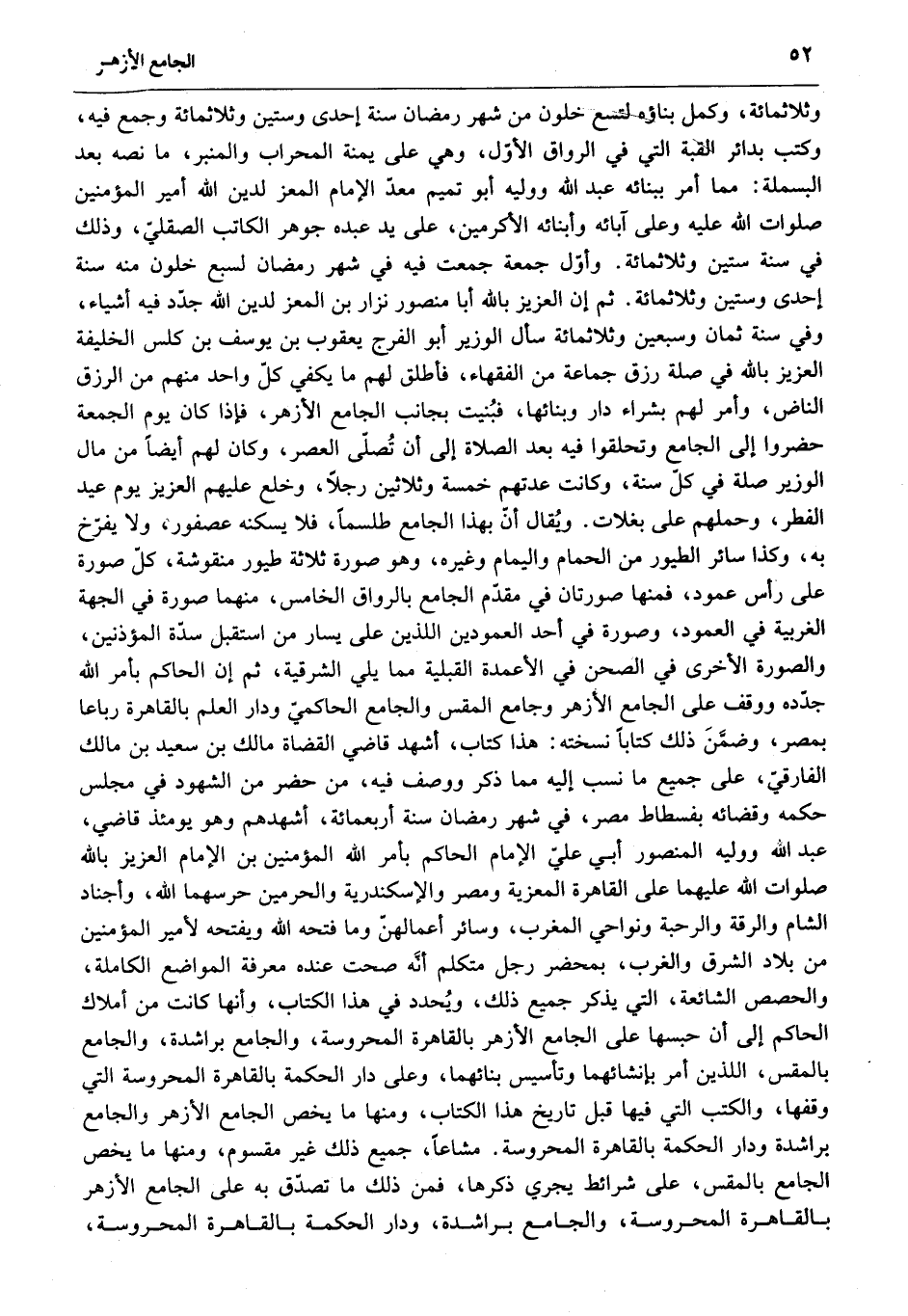 وثلاثمائة، وكمل بناؤه لتسع خلون من شهر رمضان سنة إحدى وستين وثلاثمائة وجمع فيه، وكتب بدائر القبة التي في الرواق الأوّل، وهي على يمنة المحراب والمنبر، ما نصه بعد البسملة: مما أمر ببنائه عبد الله ووليه أبو تميم معدّ الإمام المعز لدين الله أمير المؤمنين صلوات الله عليه وعلى آبائه وأبنائه الأكرمين، على يد عبده جوهر الكاتب الصقليّ، وذلك في سنة ستين وثلاثمائة. وأوّل جمعة جمعت فيه في شهر رمضان لسبع خلون منه سنة إحدى وستين وثلاثمائة. ثم إن العزيز بالله أبا منصور نزار بن المعز لدين الله جدّد فيه أشياء، وفي سنة ثمان وسبعين وثلاثمائة سأل الوزير أبو الفرج يعقوب بن يوسف بن كلس الخليفة العزيز بالله في صلة رزق جماعة من الفقهاء، فأطلق لهم ما يكفي كلّ واحد منهم من الرزق الناض، وأمر لهم بشراء دار وبنائها، فبنيت بجانب الجامع الأزهر، فإذا كان يوم الجمعة حضروا إلى الجامع وتحلقوا فيه بعد الصلاة إلى أن تصلّى العصر، وكان لهم أيضا من مال الوزير صلة في كلّ سنة، وكانت عدتهم خمسة وثلاثين رجلا، وخلع عليهم العزيز يوم عيد الفطر، وحملهم على بغلات. ويقال أنّ بهذا الجامع طلسما، فلا يسكنه عصفور، ولا يفرّخ به، وكذا سائر الطيور من الحمام واليمام وغيره، وهو صورة ثلاثة طيور منقوشة، كلّ صورة على رأس عمود، فمنها صورتان في مقدّم الجامع بالرواق الخامس، منهما صورة في الجهة الغربية في العمود، وصورة في أحد العمودين اللذين على يسار من استقبل سدّة المؤذنين، والصورة الأخرى في الصحن في الأعمدة القبلية مما يلي الشرقية، ثم إن الحاكم بأمر الله جدّده ووقف على الجامع الأزهر وجامع المقس والجامع الحاكميّ ودار العلم بالقاهرة رباعا بمصر، وضمّن ذلك كتابا نسخته: هذا كتاب، أشهد قاضي القضاة مالك بن سعيد بن مالك الفارقيّ، على جميع ما نسب إليه مما ذكر ووصف فيه، من حضر من الشهود في مجلس حكمه وقضائه بفسطاط مصر، في شهر رمضان سنة أربعمائة، أشهدهم وهو يومئذ قاضي، عبد الله ووليه المنصور أبي عليّ الإمام الحاكم بأمر الله المؤمنين بن الإمام العزيز بالله صلوات الله عليهما على القاهرة المعزية ومصر والإسكندرية والحرمين حرسهما الله، وأجناد الشام والرقة والرحبة ونواحي المغرب، وسائر أعمالهنّ وما فتحه الله ويفتحه لأمير المؤمنين من بلاد الشرق والغرب، بمحضر رجل متكلم أنّه صحت عنده معرفة المواضع الكاملة، والحصص الشائعة، التي يذكر جميع ذلك، ويحدد في هذا الكتاب، وأنها كانت من أملاك الحاكم إلى أن حبسها على الجامع الأزهر بالقاهرة المحروسة، والجامع براشدة، والجامع بالمقس، اللذين أمر بإنشائهما وتأسيس بنائهما، وعلى دار الحكمة بالقاهرة المحروسة التي وقفها، والكتب التي فيها قبل تاريخ هذا الكتاب، ومنها ما يخص الجامع الأزهر والجامع براشدة ودار الحكمة بالقاهرة المحروسة. مشاعا، جميع ذلك غير مقسوم، ومنها ما يخص الجامع بالمقس، على شرائط يجري ذكرها، فمن ذلك ما تصدّق به على الجامع الأزهر بالقاهرة المحروسة، والجامع براشدة، ودار الحكمة بالقاهرة المحروسة،