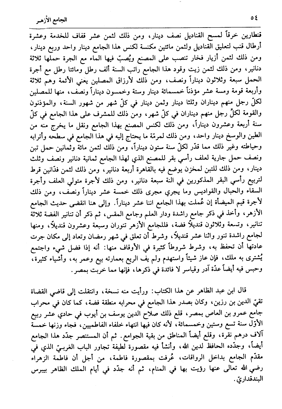 قنطارين خرقا لمسح القناديل نصف دينار، ومن ذلك لثمن عشر قفاف للخدمة وعشرة أرطال قنب لتعليق القناديل ولثمن مائتين مكنسة لكنس هذا الجامع دينار واحد وربع دينار، ومن ذلك لثمن أزيار فخار تنصب على المصنع ويصبّ فيها الماء مع الجرة حملها ثلاثة دنانير، ومن ذلك لثمن زيت وقود هذا الجامع راتب السنة ألف رطل ومائتا رطل مع أجرة الحمل سبعة وثلاثون دينارا ونصف، ومن ذلك لأرزاق المصلين يعني الأئمة وهم ثلاثة وأربعة قومة ومسة عشر مؤذنا خمسمائة دينار وستة وخمسون دينارا ونصف، منها للمصلين لكلّ رجل منهم ديناران وثلثا دينار وثمن دينار في كلّ شهر من شهور السنة، والمؤذنون والقومة لكلّ رجل منهم ديناران في كلّ شهر، ومن ذلك للمشرف على هذا الجامع في كلّ سنة أربعة وعشرون دينارا، ومن ذلك لكنس المصنع بهذا الجامع ونقل ما يخرج منه من الطين والوسخ دينار واحد، ومن ذلك لمرمّة ما يحتاج إليه في هذا الجامع في سطحه وأترابه وحياطته وغير ذلك مما قدّر لكلّ سنة ستون دينارا، ومن ذلك لثمن مائة وثمانين حمل تبن ونصف حمل جارية لعلف رأسي بقر للمصنع الذي لهذا الجامع ثمانية دنانير ونصف وثلث دينار، ومن ذلك للتبن لمخزن يوضع فيه بالقاهرة أربعة دنانير، ومن ذلك لثمن فدّانين قرط لتربيع رأسي البقر المذكورين في النة سبعة دنانير، ومن ذلك لأجرة متولي العلف وأجرة السقاء والحبال والقواديس وما يجري مجرى ذلك خمسة عشر دينارا ونصف، ومن ذلك لأجرة قيم الميضأة إن عملت بهذا الجامع اننا عشر دينارا. وإلى هنا انقضى حديث الجامع الأزهر، وأخذ في ذكر جامع راشدة ودار العلم وجامع المقس، ثم ذكر أن تنانير الفضة ثلاثة تنانير، وتسعة وثلاثون قنديلا فضة، فللجامع الأزهر تنوران وسبعة وعشرون قنديلا، ومنها لجامع راشدة تنور واثنا عشر قنديلا، وشرط أن تعلق في شهر رمضان وتعاد إلى مكان جرت عادتها أن تحفظ به، وشرط شروطا كثيرة في الأوقاف منها: أنه إذا فضل شيء واجتمع يشترى به ملك، فإن عاز شيئا واستهدم ولم يف الريع بعمارته بيع وعمر به، وأشياء كثيرة، وحبس فيه أيضا عدّة آدر وقياسر لا فائدة في ذكرها، فإنها مما خربت بمصر.