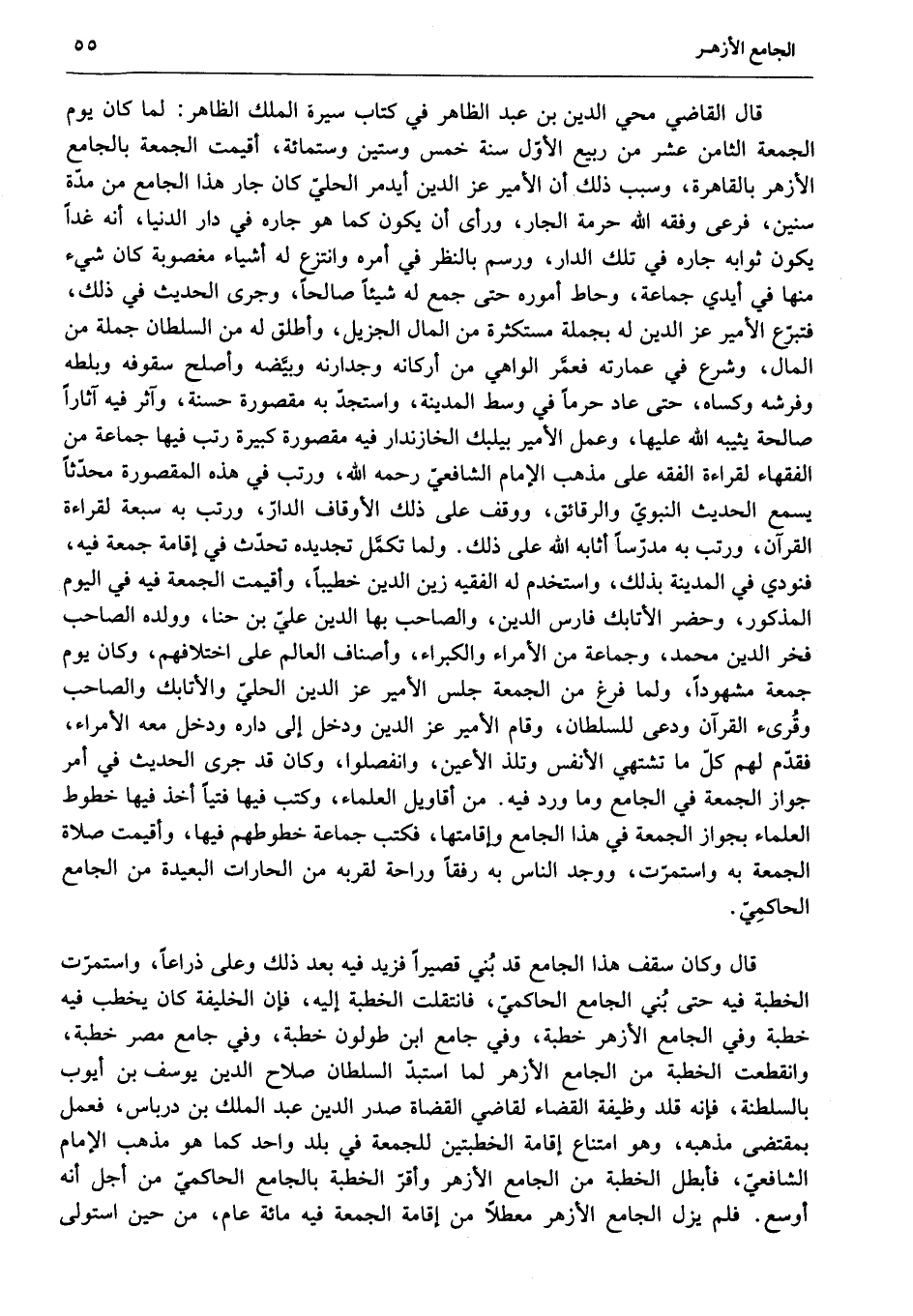 قال وكان سقف هذا الجامع قد بني قصيرا فزيد فيه بعد ذلك وعلى ذراعا، واستمرّت الخطبة فيه حتى بني الجامع الحاكميّ، فانتقلت الخطبة إليه، فإن الخليفة كان يخطب فيه خطبة وفي الجامع الأزهر خطبة، وفي جامع ابن طولون خطبة، وفي جامع مصر خطبة، وانقطعت الخطبة من الجامع الأزهر لما استبدّ السلطان صلاح الدين يوسف بن أيوب بالسلطنة، فإنه قلد وظيفة القضاء لقاضي القضاة صدر الدين عبد الملك بن درباس، فعمل بمقتضى مذهبه، وهو امتناع إقامة الخطبتين للجمعة في بلد واحد كما هو مذهب الإمام الشافعيّ، فأبطل الخطبة من الجامع الأزهر وأقرّ الخطبة بالجامع الحاكميّ من أجل أنه أوسع. فلم يزل الجامع الأزهر معطلا من إقامة الجمعة فيه مائة عام، من حين استولى