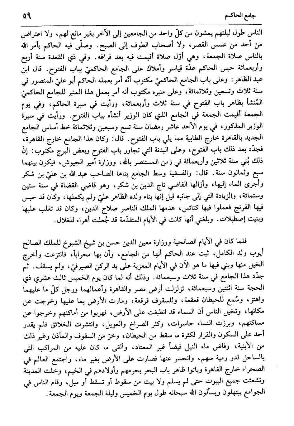 الناس طول ليلتهم يمشون من كلّ واحد من الجامعين إلى الآخر بغير مانع لهم، ولا اعتراض من أحد من عسس القصر، ولا أصحاب الطوف إلى الصبح. وصلّى فيه الحاكم بأمر الله بالناس صلاة الجمعة، وهي أوّل صلاة أقيمت فيه بعد فراغه. وفي ذي القعدة سنة أربع وأربعمائة حبس الحاكم عدّة قياسر وأملاك على الجامع الحاكميّ بباب الفتوح. قال ابن عبد الظاهر: وعلى باب الجامع الحاكميّ مكتوب أنّه أمر بعمله الحاكم أبو عليّ المنصور في سنة ثلاث وتسعين وثلاثمائة، وعلى منبره مكتوب أنه أمر بعمل هذا المنبر للجامع الحاكميّ المنشأ بظاهر باب الفتوح في سنة ثلاث وأربعمائة، ورأيت في سيرة الحاكم، وفي يوم الجمعة أقيمت الجمعة في الجامع الذي كان الوزير أنشأه بباب الفتوح. ورأيت في سيرة الوزير المذكور، في يوم الأحد عاشر رمضان سنة تسع وسبعين وثلاثمائة خط أساس الجامع الجديد بالقاهرة خارج الطابية مما يلي باب الفتوح. قال: وكان هذا الجامع خارج القاهرة، فجدّد بعد ذلك باب الفتوح، وعلى البدنة التي تجاور باب الفتوح وبعض البرج مكتوب: إنّ ذلك بني سنة ثلاثين وأربعمائة في زمن المستنصر بالله، ووزارة أمير الجيوش، فيكون بينهما سبع وثمانون سنة. قال: والفسقية وسط الجامع بناها الصاحب عبد الله بن عليّ بن شكر وأجرى الماء إليها، وأزالها القاضي تاج الدين بن شكر، وهو قاضي القضاة في سنة ستين وستمائة، والزيادة التي إلى جانبه قيل إنها بناء ولده الظاهر عليّ ولم يكملها، وكان قد حبس فيها الفرنج فعملوا فيها كنائس، هدمها الملك الناصر صلاح الدين، وكان قد تغلب عليها وبنيت إصطبلات. وبلغني أنها كانت في الأيام المتقدّمة قد جعلت أهراء للغلال.
