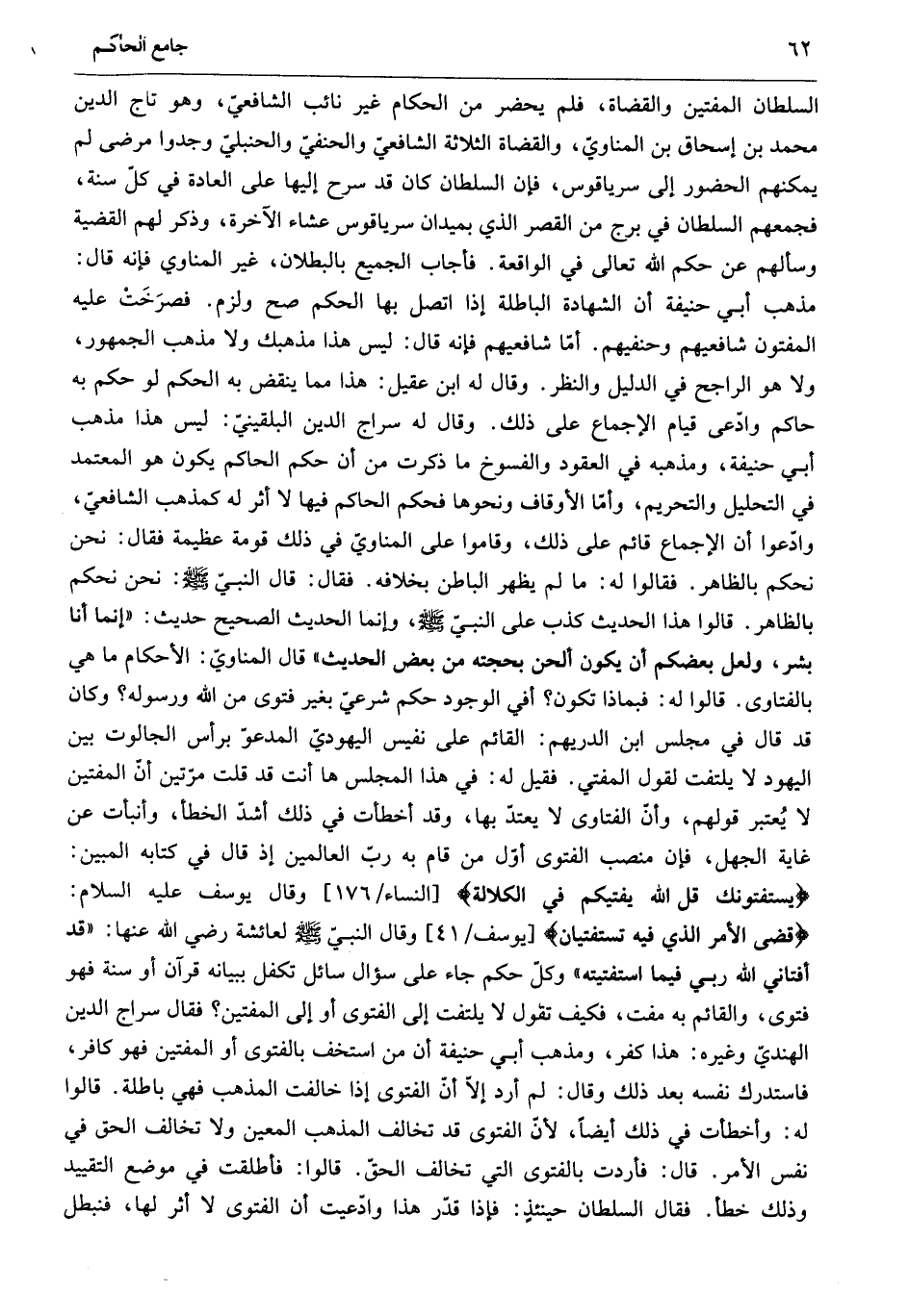 [يوسف/ 41] وقال النبيّ صلّى الله عليه وسلّم لعائشة رضي الله عنها: «قد أفتاني الله ربي فيما استفتيته» وكلّ حكم جاء على سؤال سائل تكفل ببيانه قرآن أو سنة فهو فتوى، والقائم به مفت، فكيف تقول لا يلتفت إلى الفتوى أو إلى المفتين؟ فقال سراج الدين الهنديّ وغيره: هذا كفر، ومذهب أبي حنيفة أن من استخف بالفتوى أو المفتين فهو كافر، فاستدرك نفسه بعد ذلك وقال: لم أرد إلّا أنّ الفتوى إذا خالف المذهب فهي باطلة. قالوا له: وأخطأت في ذلك أيضا، لأنّ الفتوى قد تخالف المذهب المعين ولا تخالف الحق في نفس الأمر. قال: فأردت بالفتوى التي تخالف الحقّ. قالوا: فأطلقت في موضع التقييد وذلك خطأ. فقال السلطان حينئذ: فإذا قدّر هذا وادّعيت أن الفتوى لا أثر لها، فنبطل
