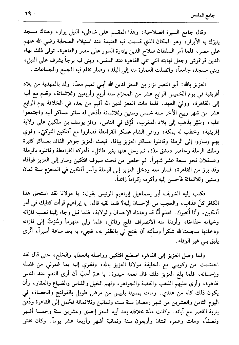 العزيز بالله: أبو النصر نزار بن المعز لدين الله أبي تميم معدّ، ولد بالمهدية من بلاد أقريقية في يوم الخميس الرابع عشر من المحرّم سنة أربع وأربعين وثلاثمائة، وقدم مع أبيه إلى القاهرة، وولي العهد. فلما مات المعز لدين الله أقيم من بعده في الخلافة يوم الرابع عشر من شهر ربيع الآخر سنة خمس وستين وثلاثمائة فأذعن له سائر عساكر أبيه واجتمعوا عليه، وسيّر بذهب إلى بلاد المغرب، فرّق في الناس، واقرّ يوسف بن ملكين على ولاية إفريقية، وخطب له بمكة، ووافى الشام عسكر القرامطة فصاروا مع أفتكين التركيّ، وقوي بهم وساروا إلى الرملة وقاتلوا عساكر العزيز بيافا، فبعث العزيز جوهر القائد بعساكر كثيرة وملك الرملة وحاصر دمشق مدّة، ثم رحل عنها بغير طائل، فأدركه القرامطة وقاتلوه بالرملة وعسقلان نحو سبعة عشر شهرا، ثم خلص من تحت سيوف افتكين وسار إلى العزيز فوافاه وقد برز من القاهرة، فسار معه ودخل العزيز إلى الرملة وأسر أفتكين في المحرّم سنة ثمان وستين وثلاثمائة فأحسن إليه وأكرمه إكراما زائدا.