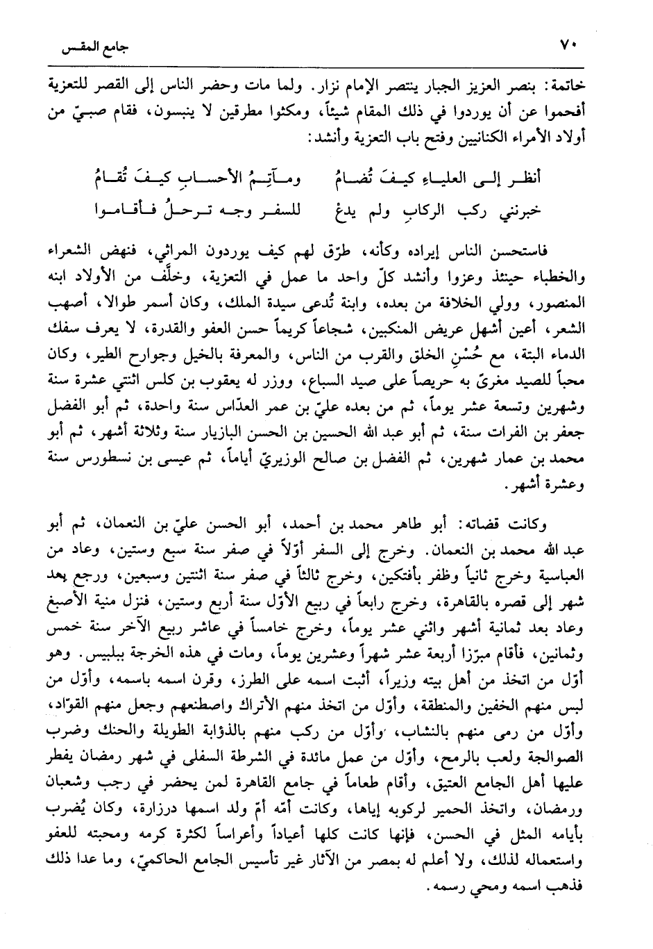 خاتمة: بنصر العزيز الجبار ينتصر الإمام نزار. ولما مات وحضر الناس إلى القصر للتعزية أفحموا عن أن يوردوا في ذلك المقام شيئا، ومكثوا مطرقين لا ينبسون، فقام صبيّ من أولاد الأمراء الكنانيين وفتح باب التعزية وأنشد: