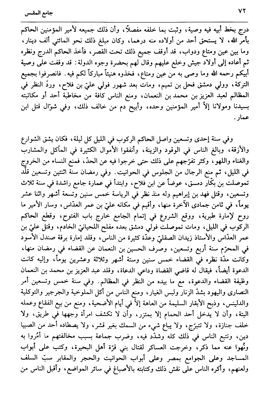 وفي سنة إحدى وتسعين واصل الحاكم الركوب في الليل كل ليلة، فكان يشق الشوارع والأزقة، وبالغ الناس في الوقود والزينة، وأنفقوا الأموال الكثيرة في المآكل والمشارب والغناء واللهو، وكثر تفرّجهم على ذلك حتى خرجوا فيه عن الحدّ، فمنع النساء من الخروج في الليل، ثم منع الرجال من الجلوس في الحوانيت. وفي رمضان سنة اثنتين وتسعين قلّد تموصلت بن بكّار دمسق، عوضا عن ابن فلاح، وابتدأ في عمارة جامع راشدة في سنة ثلاث وتسعين، وقتل فهد بن إبراهيم وله منذ نظر في الرياسة خمس سنين وتسعة أشهر واثنا عشر يوما، في ثامن جمادى الآخرة منها، وأقيم في مكانه عليّ بن عمر العدّاس، وسار الأمير ما روح لإمارة طبرية، ووقع الشروع في إتمام الجامع خارج باب الفتوح، وقطع الحاكم الركوب في الليل، ومات تموصلت فولي دمشق بعده مفلح اللحيانيّ الخادم، وقتل عليّ بن عمر العدّاس والأستاذ زيدان الصقليّ وعدّة كثيرة من الناس، وقلد إمارة برقة صندل الأسود في المحرّم سنة أربع وتسعين، وصرف الحسين بن النعمان عن القضاء في رمضان منها، وكانت مدّة نظره في القضاء خمس سنين وستة أشهر وثلاثة وعشرين يوما، وإليه كانت الدعوة أيضا، فيقال له قاضي القضاة وداعي الدعاة، وقلد عبد العزيز بن محمد بن النعمان وظيفة القضاء والدعوة، مع ما بيده من النظر في المظالم. وفي سنة خمس وتسعين أمر النصارى واليهود بشدّ الزنار ولبس الغيار، ومنع الناس من أكل الملوخية والجرجير والتوكلية والدلينس، وذبح الأبقار السليمة من العاهة إلّا في أيام الأضحية، ومنع من بيع الفقاع وعمله البتة، وأن لا يدخل أحد الحمام إلا بمئزر، وأن لا تكشف امرأة وجهها في طريق، ولا خلف جنازة، ولا تتبرّج، ولا يباع شيء من السمك بغير قشر، ولا يصطاده أحد من الصيادين، وتتبع الناس في ذلك كله وشدّد فيه، وضرب جماعة بسبب مخالفتهم ما أمروا به ونهوا عنه مما ذكر، وخرجت العساكر لقتال بني قرّة أهل البحيرة، وكتب على أبواب المساجد وعلى الجوامع بمصر وعلى أبواب الحوانيت والحجر والمقابر سبّ السلف ولعنهم، وأكره الناس على نقش ذلك وكتابته بالأصباغ في سائر المواضع، وأقبل الناس من