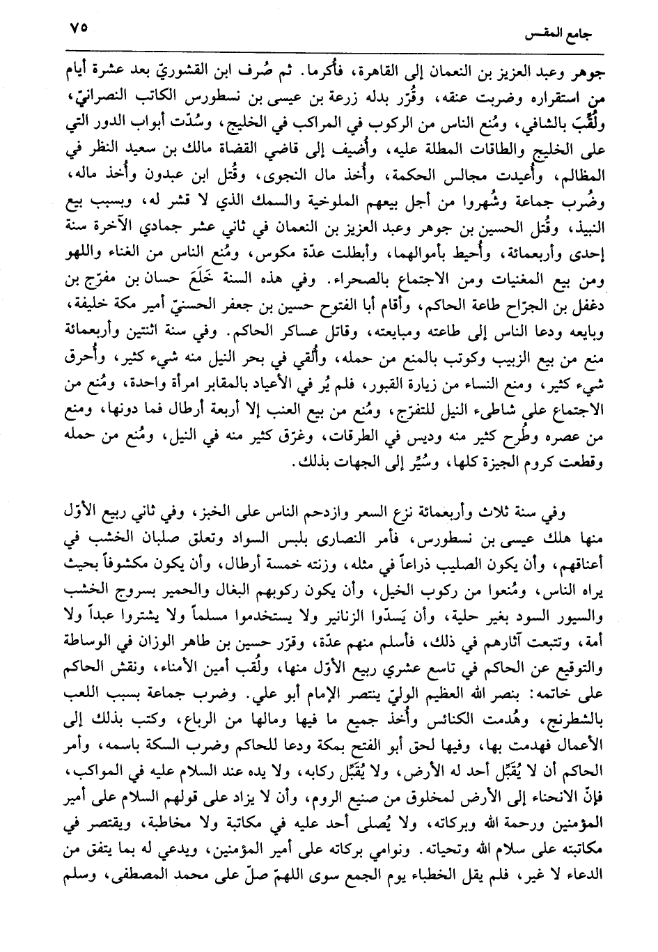 وفي سنة ثلاث وأربعمائة نزع السعر وازدحم الناس على الخبز، وفي ثاني ربيع الأوّل منها هلك عيسى بن نسطورس، فأمر النصارى بلبس السواد وتعلق صلبان الخشب في أعناقهم، وأن يكون الصليب ذراعا في مثله، وزنته خمسة أرطال، وأن يكون مكشوفا بحيث يراه الناس، ومنعوا من ركوب الخيل، وأن يكون ركوبهم البغال والحمير بسروج الخشب والسيور السود بغير حلية، وأن يسدّوا الزنانير ولا يستخدموا مسلما ولا يشتروا عبدا ولا أمة، وتتبعت آثارهم في ذلك، فأسلم منهم عدّة، وقرّر حسين بن طاهر الوزان في الوساطة والتوقيع عن الحاكم في تاسع عشري ربيع الأوّل منها، ولقب أمين الأمناء، ونقش الحاكم على خاتمه: بنصر الله العظيم الوليّ ينتصر الإمام أبو علي. وضرب جماعة بسبب اللعب بالشطرنج، وهدمت الكنائس وأخذ جميع ما فيها ومالها من الرباع، وكتب بذلك إلى الأعمال فهدمت بها، وفيها لحق أبو الفتح بمكة ودعا للحاكم وضرب السكة باسمه، وأمر الحاكم أن لا يقبّل أحد له الأرض، ولا يقبّل ركابه، ولا يده عند السلام عليه في المواكب، فإنّ الانحناء إلى الأرض لمخلوق من صنيع الروم، وأن لا يزاد على قولهم السلام على أمير المؤمنين ورحمة الله وبركاته، ولا يصلّى أحد عليه في مكاتبة ولا مخاطبة، ويقتصر في مكاتبته على سلام الله وتحياته. ونوامي بركاته على أمير المؤمنين، ويدعي له بما يتفق من الدعاء لا غير، فلم يقل الخطباء يوم الجمع سوى اللهمّ صلّ على محمد المصطفى، وسلّم