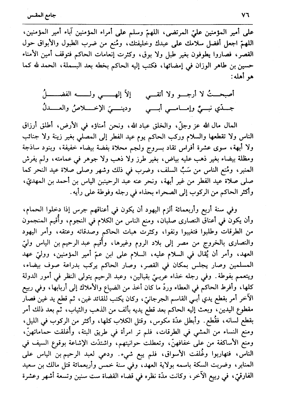 المال مال الله عز وجلّ، والخلق عباد الله، ونحن أمناؤه في الأرض، أطلق أرزاق الناس ولا تقطعها والسلام وركب الحاكم يوم عيد الفطر إلى المصلي بغير زينة ولا جنائب ولا أبهة، سوى عشرة أفراس تقاد بسروج ولجم محلاة بفضة بيضاء خفيفة، وبنود ساذجة ومظلة بيضاء بغير ذهب عليه بياض، بغير طرز ولا ذهب ولا جوهر في عمامته، ولم يفرش المنبر، ومنع الناس من سبّ السلف، وضرب في ذلك وشهر وصلّى صلاة عيد النحر كما صلّى صلاة عيد الفطر من غير أبهة، ونحر عنه عبد الرحمن بن الياس بن أحمد بن المهديّ، وأكثر الحاكم من الركوب إلى الصحراء بحذاء في رجله وفوطة على رأيه.