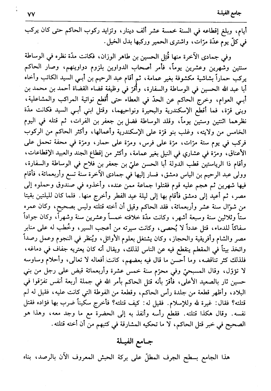 وفي جمادى الآخرة منها قتل الحسين بن طاهر الوزان، فكانت مدّة نظره في الوساطة سنتين وشهرين وعشرين يوما، فأمر أصحاب الدواوين بلزوم دواوينهم، وصار الحاكم يركب حمارا بشاشية مكشوفة بغير عمامة، ثم أقام عبد الرحيم بن أبي السيد الكاتب وأخاه أبا عبد الله الحسين في الوساطة والسفارة، وأقرّ في وظيفة قضاء القضاة أحمد بن محمد بن أبي العوام، وخرج الحاكم عن الحدّ في العطاء حتى أقطع نواتية المراكب والمشاعلية، وبنى قرّة، فما أقطع الإسكندرية والبحيرة ونواحيهما، وقتل ابني أبي السيد فكانت مدّة نظرهما اثنتين وستين يوما، وقلد الوساطة فضل بن جعفر بن الفرات، ثم قتله في اليوم الخامس من ولايته، وغلب بنو قرّة على الإسكندرية وأعمالها، وأكثر الحاكم من الركوب فركب في يوم ستة مرّات، مرّة على فرس، ومرّة على حمار، ومرّة في محفة تحمل على الأعناق، ومرّة في عشاري في النيل بغير عمامة، وأكثر من إقطاع الجند والعبيد الإقطاعات، وأقام ذا الرياستين قطب الدولة أبا الحسن عليّ بن جعفر بن فلاح في الوساطة والسفارة، وولى عبد الرحيم بن الياس دمشق، فسار إليها في جمادى الآخرة سنة تسع وأربعمائة، فأقام فيها شهرين ثم هجم عليه قوم فقتلوا جماعة ممن عنده، وأخذوه في صندوق وحملوه إلى مصر، ثم أعيد إلى دمشق فأقام بها إلى ليلة عيد الفطر وأخرج منها. فلما كان لليلتين بقيتا من شوّال سنة عشر وأربعمائة، فقد الحاكم وقيل أن أخته قتلته وليس بصحيح، وكان عمره ستا وثلاثين سنة وسبعة أشهر، وكانت مدّة خلافته خمسا وعشرين سنة وشهرا، وكان جوادا سفاكا للدماء، قتل عددا لا يحصى، وكانت سيرته من أعجب السير، وخطب له على منابر مصر والشام وأفريقية والحجاز، وكان يشتغل بعلوم الأوائل، وينظر في النجوم وعمل رصدا واتخذ بيتا في المقطم ينقطع فيه عن الناس لذلك، ويقال أنه كان يعتريه جفاف في دماغه، فلذلك كثر تناقضه، وما أحسن ما قال فيه بعضهم، كانت أفعاله لا تعالى، وأحلام وساوسه لا تؤوّل، وقال المسبحيّ وفي محرّم سنة خمس عشرة وأربعمائة قبض على رجل من بني حسين ثار بالصعيد الأعلى، فأقرّ بأنه قتل الحاكم بأمر الله في جملة أربعة أنفس تفرّقوا في البلاد، وأظهر قطعة من جلدة رأس الحاكم، وقطعة من الفوطة التي كانت عليه، فقيل له لم قتلته؟ فقال: غيرة لله وللإسلام. فقيل له: كيف قتلته؟ فأخرج سكينا ضرب بها فؤاده فقتل نفسه. وقال هكذا قتلته. فقطع رأسه وأنفذ به إلى الحضرة مع ما وجد معه، وهذا هو الصحيح في خبر قتل الحاكم، لا ما تحكيه المشارقة في كتبهم من أن أخته قتلته.