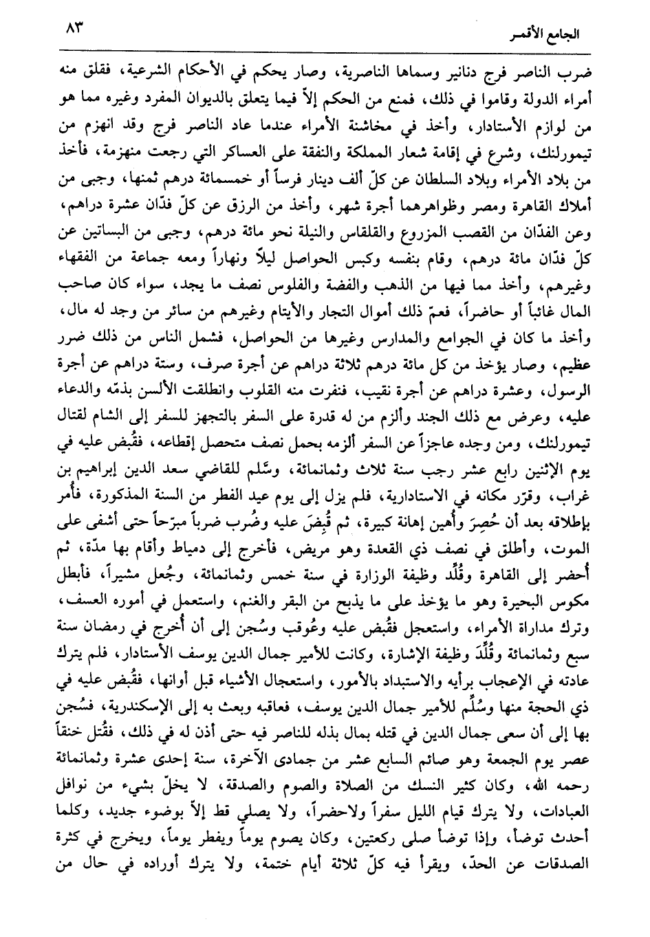 ضرب الناصر فرج دنانير وسماها الناصرية، وصار يحكم في الأحكام الشرعية، فقلق منه أمراء الدولة وقاموا في ذلك، فمنع من الحكم إلّا فيما يتعلق بالديوان المفرد وغيره مما هو من لوازم الأستادار، وأخذ في مخاشنة الأمراء عند ما عاد الناصر فرج وقد انهزم من تيمور لنك، وشرع في إقامة شعار المملكة والنفقة على العساكر التي رجعت منهزمة، فأخذ من بلاد الأمراء وبلاد السلطان عن كلّ ألف دينار فرسا أو خمسمائة درهم ثمنها، وجبى من أملاك القاهرة ومصر وظواهرهما أجرة شهر، وأخذ من الرزق عن كلّ فدّان عشرة دراهم، وعن الفدّان من القصب المزروع والقلقاس والنيلة نحو مائة درهم، وجبى من البساتين عن كلّ فدّان مائة درهم، وقام بنفسه وكبس الحواصل ليلا ونهارا ومعه جماعة من الفقهاء وغيرهم، وأخذ مما فيها من الذهب والفضة والفلوس نصف ما يجد، سواء كان صاحب المال غائبا أو حاضرا، فعمّ ذلك أموال التجار والأيتام وغيرهم من سائر من وجد له مال، وأخذ ما كان في الجوامع والمدارس وغيرها من الحواصل، فشمل الناس من ذلك ضرر عظيم، وصار يؤخذ من كل مائة درهم ثلاثة دراهم عن أجرة صرف، وستة دراهم عن أجرة الرسول، وعشرة دراهم عن أجرة نقيب، فنفرت منه القلوب وانطلقت الألسن بذمّه والدعاء عليه، وعرض مع ذلك الجند وألزم من له قدرة على السفر بالتجهز للسفر إلى الشام لقتال تيمور لنك، ومن وجده عاجزا عن السفر ألزمه بحمل نصف متحصل إقطاعه، فقبض عليه في يوم الاثنين رابع عشر رجب سنة ثلاث وثمانمائة، وسلّم للقاضي سعد الدين إبراهيم بن غراب، وقرّر مكانه في الاستادارية، فلم يزل إلى يوم عيد الفطر من السنة المذكورة، فأمر بإطلاقه بعد أن حصر وأهين إهانة كبيرة، ثم قبض عليه وضرب ضربا مبرّحا حتى أشفى على الموت، وأطلق في نصف ذي القعدة وهو مريض، فأخرج إلى دمياط وأقام بها مدّة، ثم أحضر إلى القاهرة وقلّد وظيفة الوزارة في سنة خمس وثمانمائة، وجعل مشيرا، فأبطل مكوس البحيرة وهو ما يؤخذ على ما يذبح من البقر والغنم، واستعمل في أموره العسف، وترك مداراة الأمراء، واستعجل فقبض عليه وعوقب وسجن إلى أن أخرج في رمضان سنة سبع وثمانمائة وقلّد وظيفة الإشارة، وكانت للأمير جمال الدين يوسف الأستادار، فلم يترك عادته في الإعجاب برأيه والاستبداد بالأمور، واستعجال الأشياء قبل أوانها، فقبض عليه في ذي الحجة منها وسلّم للأمير جمال الدين يوسف، فعاقبه وبعث به إلى الإسكندرية، فسجن بها إلى أن سعى جمال الدين في قتله بمال بذله للناصر فيه حتى أذن له في ذلك، فقتل خنقا عصر يوم الجمعة وهو صائم السابع عشر من جمادى الآخرة، سنة إحدى عشرة وثمانمائة رحمه الله، وكان كثير النسك من الصلاة والصوم والصدقة، لا يخلّ بشيء من نوافل العبادات، ولا يترك قيام الليل سفرا ولا حضرا، ولا يصلي قط إلّا بوضوء جديد، وكلما أحدث توضأ، وإذا توضأ صلّى ركعتين، وكان يصوم يوما ويفطر يوما، ويخرج في كثرة الصدقات عن الحدّ، ويقرأ فيه كلّ ثلاثة أيام ختمة، ولا يترك أوراده في حال من