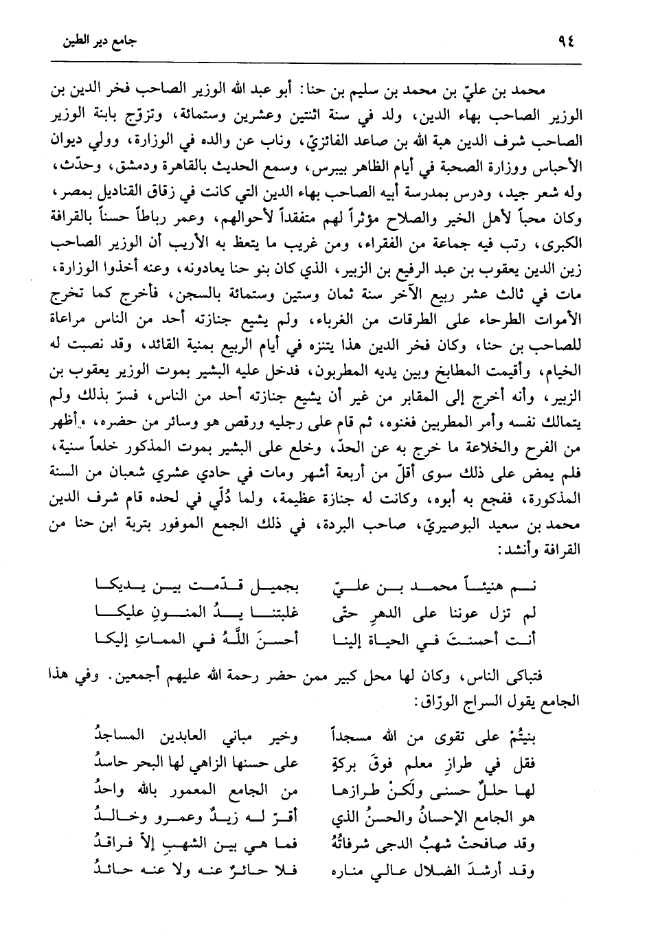 محمد بن عليّ بن محمد بن سليم بن حنا: أبو عبد الله الوزير الصاحب فخر الدين بن الوزير الصاحب بهاء الدين، ولد في سنة اثنتين وعشرين وستمائة، وتزوّج بابنة الوزير الصاحب شرف الدين هبة الله بن صاعد الفائزيّ، وناب عن والده في الوزارة، وولي ديوان الأحباس ووزارة الصحبة في أيام الظاهر بيبرس، وسمع الحديث بالقاهرة ودمشق، وحدّث، وله شعر جيد، ودرس بمدرسة أبيه الصاحب بهاء الدين التي كانت في زقاق القناديل بمصر، وكان محبا لأهل الخير والصلاح مؤثرا لهم متفقدا لأحوالهم، وعمر رباطا حسنا بالقرافة الكبرى، رتب فيه جماعة من الفقراء، ومن غريب ما يتعظ به الأريب أن الوزير الصاحب زين الدين يعقوب بن عبد الرفيع بن الزبير، الذي كان بنو حنا يعادونه، وعنه أخذوا الوزارة، مات في ثالث عشر ربيع الآخر سنة ثمان وستين وستمائة بالسجن، فأخرج كما تخرج الأموات الطرحاء على الطرقات من الغرباء، ولم يشيع جنازته أحد من الناس مراعاة للصاحب بن حنا، وكان فخر الدين هذا يتنزه في أيام الربيع بمنية القائد، وقد نصبت له الخيام، وأقيمت المطابخ وبين يديه المطربون، فدخل عليه البشير بموت الوزير يعقوب بن الزبير، وأنه أخرج إلى المقابر من غير أن يشيع جنازته أحد من الناس، فسرّ بذلك ولم يتمالك نفسه وأمر المطربين فغنوه، ثم قام على رجليه ورقص هو وسائر من حضره، وأظهر من الفرح والخلاعة ما خرج به عن الحدّ، وخلع على البشير بموت المذكور خلعا سنية، فلم يمض على ذلك سوى أقلّ من أربعة أشهر ومات في حادي عشري شعبان من السنة المذكورة، ففجع به أبوه، وكانت له جنازة عظيمة، ولما دلّي في لحده قام شرف الدين محمد بن سعيد البوصيريّ، صاحب البردة، في ذلك الجمع الموفور بتربة ابن حنا من القرافة وأنشد: