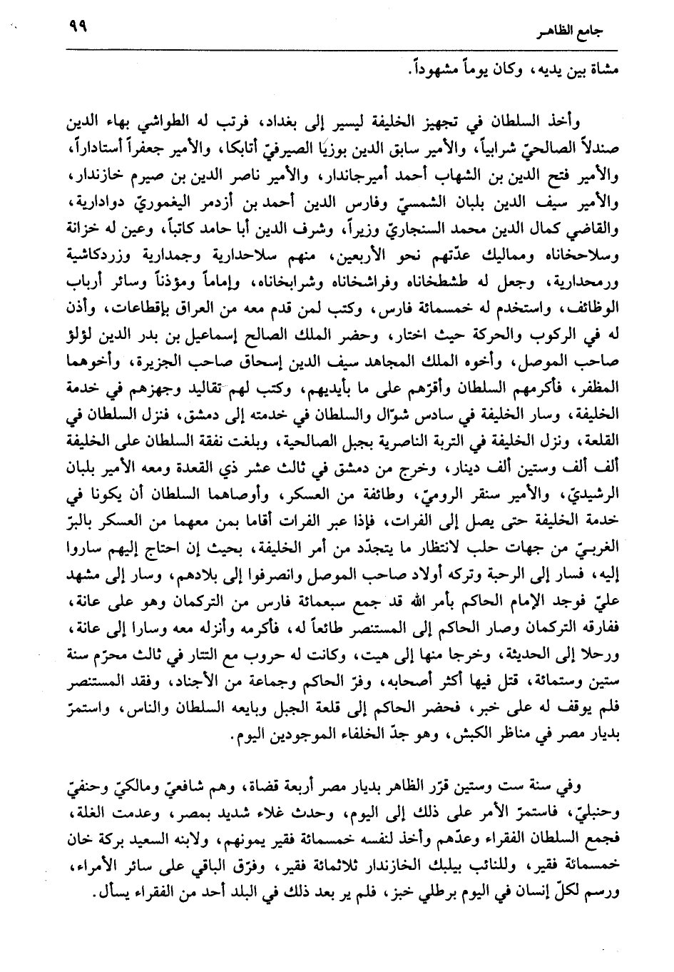 وأخذ السلطان في تجهيز الخليفة ليسير إلى بغداد، فرتب له الطواشي بهاء الدين صندلا الصالحيّ شرابيا، والأمير سابق الدين بوزيا الصيرفيّ أتابكا، والأمير جعفرا أستادارا، والأمير فتح الدين بن الشهاب أحمد أمير جاندار، والأمير ناصر الدين بن صيرم خازندار، والأمير سيف الدين بلبان الشمسيّ وفارس الدين أحمد بن أزدمر اليغموريّ دوادارية، والقاضي كمال الدين محمد السنجاريّ وزيرا، وشرف الدين أبا حامد كاتبا، وعين له خزانة وسلاحخاناه ومماليك عدّتهم نحو الأربعين، منهم سلاحدارية وجمدارية وزردكاشية ورمحدارية، وجعل له طشطخاناه وفراشخاناه وشرابخاناه، وإماما ومؤذنا وسائر أرباب الوظائف، واستخدم له خمسمائة فارس، وكتب لمن قدم معه من العراق بإقطاعات، وأذن له في الركوب والحركة حيث اختار، وحضر الملك الصالح إسماعيل بن بدر الدين لؤلؤ صاحب الموصل، وأخوه الملك المجاهد سيف الدين إسحاق صاحب الجزيرة، وأخوهما المظفر، فأكرمهم السلطان وأقرّهم على ما بأيديهم، وكتب لهم تقاليد وجهزهم في خدمة الخليفة، وسار الخليفة في سادس شوّال والسلطان في خدمته إلى دمشق، فنزل السلطان في القلعة، ونزل الخليفة في التربة الناصرية بجبل الصالحية، وبلغت نفقة السلطان على الخليفة ألف ألف وستين ألف دينار، وخرج من دمشق في ثالث عشر ذي القعدة ومعه الأمير بلبان الرشيديّ، والأمير سنقر الروميّ، وطائفة من العسكر، وأوصاهما السلطان أن يكونا في خدمة الخليفة حتى يصل إلى الفرات، فإذا عبر الفرات أقاما بمن معهما من العسكر بالبرّ الغربيّ من جهات حلب لانتظار ما يتجدّد من أمر الخليفة، بحيث إن احتاج إليهم ساروا إليه، فسار إلى الرحبة وتركه أولاد صاحب الموصل وانصرفوا إلى بلادهم، وسار إلى مشهد عليّ فوجد الإمام الحاكم بأمر الله قد جمع سبعمائة فارس من التركمان وهو على عانة، ففارقه التركمان وصار الحاكم إلى المستنصر طائعا له، فأكرمه وأنزله معه وسارا إلى عانة، ورحلا إلى الحديثة، وخرجا منها إلى هيت، وكانت له حروب مع التتار في ثالث محرّم سنة ستين وستمائة، قتل فيها أكثر أصحابه، وفرّ الحاكم وجماعة من الأجناد، وفقد المستنصر فلم يوقف له على خبر، فحضر الحاكم إلى قلعة الجبل وبايعه السلطان والناس، واستمرّ بديار مصر في مناظر الكبش، وهو جدّ الخلفاء الموجودين اليوم.