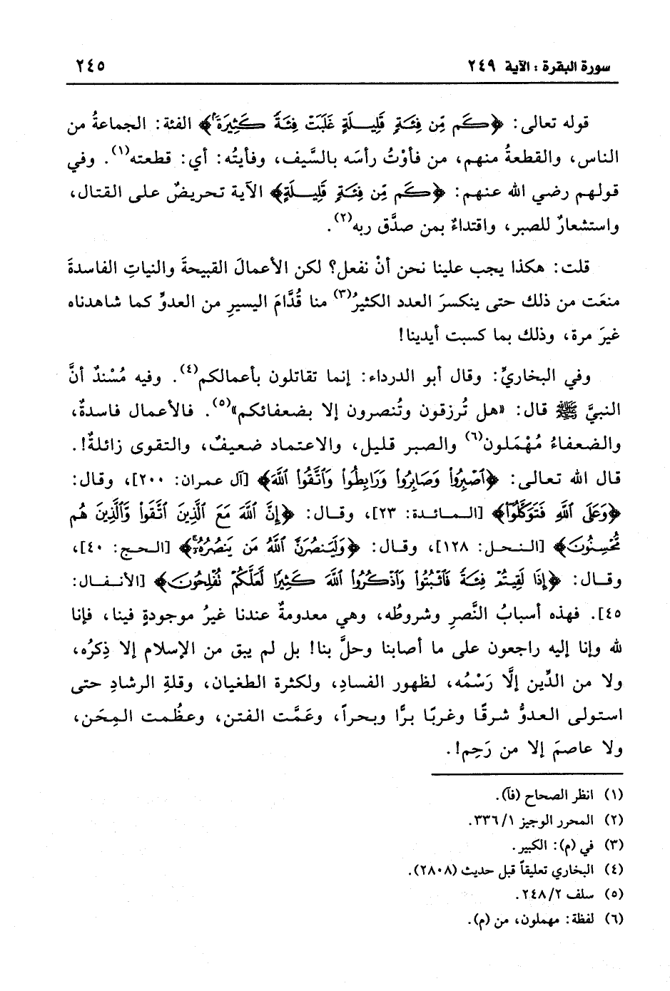 قُلْتُ: وَهَذَا الْمَعْنَى صَحِيحٌ أَيْضًا عَنِ ابْنِ عُمَرَ، كَمَا فِي صَحِيحِ الْبُخَارِيِّ قَالَ: حَدَّثَنَا عَبْدَانُ أَخْبَرَنَا أَبُو حَمْزَةَ عَنْ عُثْمَانَ بْنِ مَوْهَبٍ قَالَ: جَاءَ رَجُلٌ حَجَّ الْبَيْتَ فَرَأَى قَوْمًا جُلُوسًا فَقَالَ: مَنْ هَؤُلَاءِ الْقُعُودُ؟ قَالُوا: هَؤُلَاءِ قُرَيْشٌ. قَالَ: مَنِ الشَّيْخُ؟ قَالُوا: ابْنُ عمر، فأتاه فقال: إني سائلك عن شي أَتُحَدِّثُنِي؟ قَالَ: أَنْشُدُكَ بِحُرْمَةِ هَذَا الْبَيْتِ، أَتَعْلَمُ أَنَّ عُثْمَانَ بْنَ عَفَّانَ فَرَّ يَوْمَ أُحُدٍ؟ قَالَ: نَعَمْ. قَالَ: فَتَعْلَمُهُ تَغَيَّبَ عَنْ بَدْرٍ فَلَمْ يَشْهَدْهَا؟ قَالَ: نَعَمْ. قَالَ: فَتَعْلَمُ أَنَّهُ تَخَلَّفَ عَنْ بَيْعَةِ الرِّضْوَانِ فَلَمْ يَشْهَدْهَا؟ قَالَ نَعَمْ. قَالَ: فَكَبَّرَ. قَالَ ابْنُ عُمَرَ: تَعَالَ لِأُخْبِرَكَ وَلِأُبَيِّنَ لَكَ عَمَّا سَأَلْتَنِي عَنْهُ، أَمَّا فِرَارُهُ يَوْمَ أُحُدٍ فَأَشْهَدُ أَنَّ اللَّهَ عَفَا عَنْهُ. وَأَمَّا تَغَيُّبُهُ عَنْ بَدْرٍ فَإِنَّهُ كَانَ تَحْتَهُ بِنْتُ رَسُولِ اللَّهِ صَلَّى اللَّهُ عَلَيْهِ وَسَلَّمَ وَكَانَتْ مَرِيضَةً، فَقَالَ لَهُ النَّبِيُّ صَلَّى اللَّهُ عَلَيْهِ وَسَلَّمَ (إِنَّ لَكَ أَجْرَ رَجُلٍ من شَهِدَ بَدْرًا وَسَهْمَهُ). وَأَمَّا تَغَيُّبُهُ عَنْ بَيْعَةِ الرِّضْوَانِ فَإِنَّهُ لَوْ كَانَ أَحَدٌ أَعَزَّ بِبَطْنِ مَكَّةَ مِنْ عُثْمَانَ بْنِ عَفَّانَ لَبَعَثَهُ مَكَانُهُ، فبعث عثمان وكانت بيعة الرضوان بعد ما ذَهَبَ عُثْمَانُ إِلَى مَكَّةَ، فَقَالَ «1» النَّبِيُّ صَلَّى اللَّهُ عَلَيْهِ وَسَلَّمَ بِيَدِهِ الْيُمْنَى: (هَذِهِ يَدُ عُثْمَانَ) فَضَرَبَ بِهَا عَلَى يَدِهِ «2» فَقَالَ: (هَذِهِ لِعُثْمَانَ). اذْهَبْ بِهَذَا «3» الْآنَ مَعَكَ. قُلْتُ: وَنَظِيرُ هَذِهِ الْآيَةِ تَوْبَةُ اللَّهِ عَلَى آدَمَ عَلَيْهِ السَّلَامُ. وَقَوْلُهُ عَلَيْهِ السَّلَامُ: (فَحَجَّ آدَمُ مُوسَى) أَيْ غَلَبَهُ بِالْحُجَّةِ، وَذَلِكَ أَنَّ مُوسَى عَلَيْهِ السَّلَامُ أَرَادَ تَوْبِيخَ آدَمَ وَلَوْمَهُ فِي إِخْرَاجِ نَفْسِهِ وَذُرِّيَّتِهِ مِنَ الْجَنَّةِ بِسَبَبِ أَكْلِهِ مِنَ الشَّجَرَةِ، فَقَالَ لَهُ آدَمُ: (أَفَتَلُومُنِي عَلَى أَمْرٍ قَدَّرَهُ اللَّهُ تَعَالَى عَلَيَّ قَبْلَ أَنْ أُخْلَقَ بِأَرْبَعِينَ سَنَةً تَابَ عَلَيَّ مِنْهُ وَمَنْ تَابَ عَلَيْهِ فَلَا ذَنْبَ لَهُ وَمَنْ لَا ذَنْبَ لَهُ لَا يَتَوَجَّهُ عَلَيْهِ لَوْمٌ (. وَكَذَلِكَ مَنْ عَفَا اللَّهُ عَنْهُ. وَإِنَّمَا كَانَ هَذَا لِإِخْبَارِهِ تَعَالَى بِذَلِكَ، وَخَبَرُهُ صِدْقٌ. وَغَيْرُهُمَا مِنَ الْمُذْنِبِينَ التَّائِبِينَ يَرْجُونَ رَحْمَتَهُ وَيَخَافُونَ عَذَابَهُ، فَهُمْ عَلَى وَجَلٍ وَخَوْفٍ أَلَّا تُقْبَلَ تَوْبَتُهُمْ، وَإِنْ قُبِلَتْ فَالْخَوْفُ أَغْلَبُ عَلَيْهِمْ إِذْ لَا عِلْمَ لَهُمْ بذلك. فأعلم.