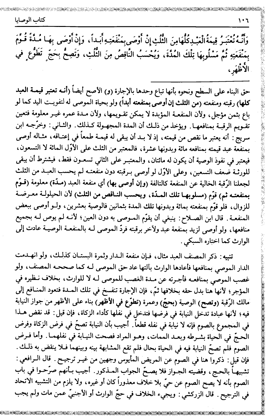 وَيُؤْخَذُ مِنْ ذَلِكَ أَنَّ الْمُدَّةَ الْمَجْهُولَةَ كَذَلِكَ. وَالثَّانِي: وَخَرَّجَهُ ابْنُ سُرَيْجٍ: أَنَّهُ يُعْتَبَرُ مَا نَقَصَ مِنْ قِيمَتِهِ، إذْ لَا بُدَّ أَنْ يَبْقَى لَهُ قِيمَةٌ طَمَعًا فِي إعْتَاقِهِ، مِثَالُهُ أَوْصَى بِمَنْفَعَةِ عَبْدٍ قِيمَتُهُ بِمَنَافِعِهِ مِائَةٌ وَبِدُونِهَا عَشَرَةٌ، فَالْمُعْتَبَرُ مِنْ الثُّلُثِ عَلَى الْأَوَّلِ الْمِائَةُ لَا التِّسْعُونَ، فَيُعْتَبَرُ فِي نُفُوذِ الْوَصِيَّةِ أَنْ يَكُونَ لَهُ مِائَتَانِ، وَالْمُعْتَبَرُ عَلَى الثَّانِي تِسْعُونَ فَقَطْ، فَيُشْتَرَطُ أَنْ يَبْقَى لِلْوَرَثَةِ ضِعْفُ التِّسْعِينَ، وَعَلَى الْأَوَّلِ لَوْ أَوْصَى بِرَقَبَتِهِ دُونَ مَنْفَعَتِهِ لَمْ يُحْسَبْ الْعَبْدُ مِنْ الثُّلُثِ لِجَعْلِنَا الرَّقَبَةَ الْخَالِيَةَ عَنْ الْمَنْفَعَةِ كَالتَّالِفَةِ (وَإِنْ أَوْصَى بِهَا) أَيْ مَنْفَعَةِ الْعَبْدِ (مُدَّةً) مَعْلُومَةً (قُوِّمَ بِمَنْفَعَتِهِ ثُمَّ) قُوِّمَ (مَسْلُوبُهَا تِلْكَ الْمُدَّةَ، وَيُحْسَبُ النَّاقِصُ مِنْ الثُّلُثِ) لِأَنَّ الْحَيْلُولَةَ مُعَرَّضَةٌ لِلزَّوَالِ، فَلَوْ قُوِّمَ بِمَنْفَعَتِهِ بِمِائَةٍ وَبِدُونِهَا تِلْكَ الْمُدَّةَ بِثَمَانِينَ فَالْوَصِيَّةُ بِعِشْرِينَ، وَلَوْ أَوْصَى بِبَعْضِ الْمَنْفَعَةِ.