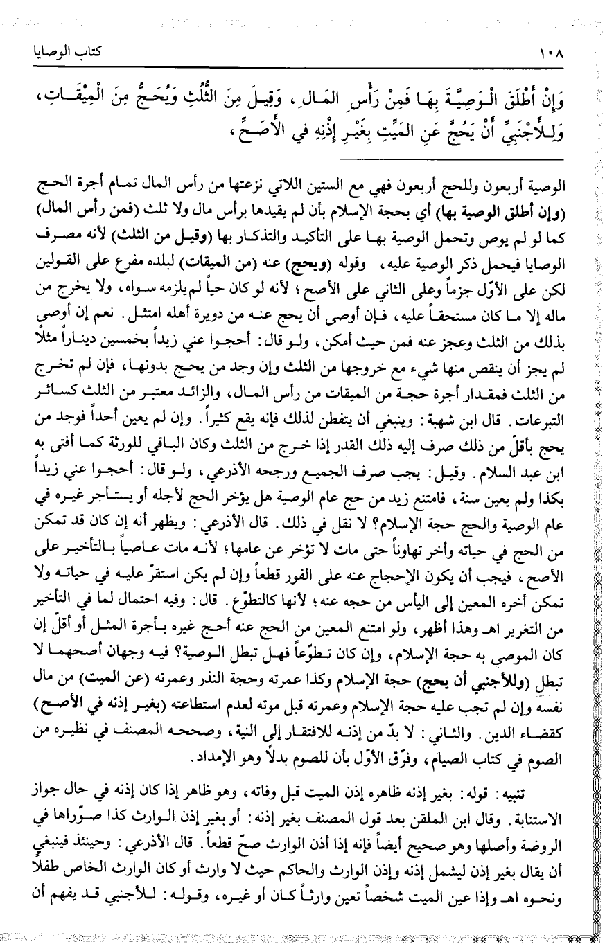 تَنْبِيهٌ: قَوْلُهُ: بِغَيْرِ إذْنِهِ ظَاهِرُهُ إذْنُ الْمَيِّتِ قَبْلَ وَفَاتِهِ، وَهُوَ ظَاهِرٌ إذَا كَانَ إذْنُهُ فِي حَالِ جَوَازِ الِاسْتِنَابَةِ. وَقَالَ ابْنُ الْمُلَقَّنِ بَعْدَ قَوْلِ الْمُصَنِّفِ بِغَيْرِ إذْنِهِ: أَوْ بِغَيْرِ إذْنِ الْوَارِثِ كَذَا صَوَّرَاهَا فِي الرَّوْضَةِ وَأَصْلِهَا وَهُوَ صَحِيحٌ أَيْضًا فَإِنَّهُ إذَا أَذِنَ الْوَارِثُ صَحَّ قَطْعًا. قَالَ الْأَذْرَعِيُّ: وَحِينَئِذٍ فَيَنْبَغِي أَنْ يُقَالَ بِغَيْرِ إذْنٍ لِيَشْمَلَ إذْنَهُ وَإِذْنَ الْوَارِثِ وَالْحَاكِمِ حَيْثُ لَا وَارِثَ أَوْ كَانَ الْوَارِثُ الْخَاصُّ طِفْلًا وَنَحْوَهُ. اهـ.