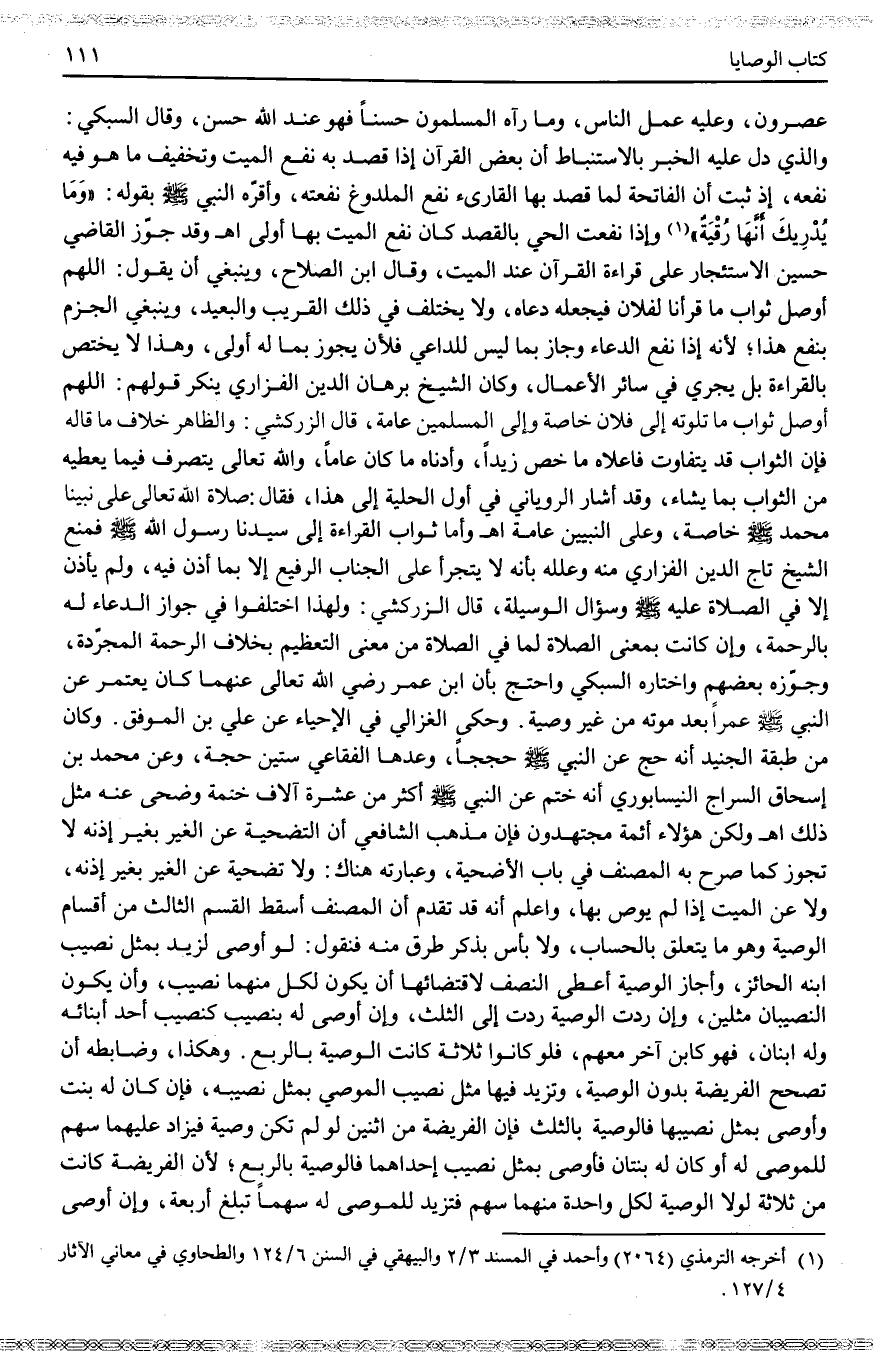 وَأَمَّا ثَوَابُ الْقِرَاءَةِ إلَى سَيِّدِنَا رَسُولِ اللَّهِ - صَلَّى اللَّهُ عَلَيْهِ وَسَلَّمَ - فَمَنَعَ الشَّيْخُ تَاجُ الدِّينِ الْفَزَارِيّ مِنْهُ وَعَلَّلَهُ بِأَنَّهُ لَا يَتَجَرَّأُ عَلَى الْجَنَابِ الرَّفِيعِ إلَّا بِمَا أَذِنَ فِيهِ، وَلَمْ يَأْذَنْ إلَّا فِي الصَّلَاةِ عَلَيْهِ - صَلَّى اللَّهُ عَلَيْهِ وَسَلَّمَ - وَسُؤَالِ الْوَسِيلَةِ، قَالَ الزَّرْكَشِيُّ: وَلِهَذَا اخْتَلَفُوا فِي جَوَازِ الدُّعَاءِ لَهُ بِالرَّحْمَةِ، وَإِنْ كَانَتْ بِمَعْنَى الصَّلَاةِ لِمَا فِي الصَّلَاةِ مِنْ مَعْنَى التَّعْظِيمِ بِخِلَافِ الرَّحْمَةِ الْمُجَرَّدَةِ، وَجَوَّزَهُ بَعْضُهُمْ وَاخْتَارَهُ السُّبْكِيُّ وَاحْتَجَّ بِأَنَّ ابْنَ عُمَرَ - رَضِيَ اللَّهُ تَعَالَى عَنْهُمَا - كَانَ يَعْتَمِرُ عَنْ النَّبِيِّ - صَلَّى اللَّهُ عَلَيْهِ وَسَلَّمَ - عُمْرَةً بَعْدَ مَوْتِهِ مِنْ غَيْرِ وَصِيَّةٍ. وَحَكَى الْغَزَالِيُّ فِي الْإِحْيَاءِ عَنْ عَلِيِّ بْنِ الْمُوَفَّقِ وَكَانَ مِنْ طَبَقَةِ الْجُنَيْدِ أَنَّهُ حَجَّ عَنْ النَّبِيِّ - صَلَّى اللَّهُ عَلَيْهِ وَسَلَّمَ - حِجَجًا، وَعَدَّهَا الْفُقَّاعِيُّ سِتِّينَ حَجَّةً، وَعَنْ مُحَمَّدِ بْنِ إِسْحَاقَ السَّرَّاجِ النَّيْسَابُورِيِّ أَنَّهُ خَتَمَ عَنْ النَّبِيِّ - صَلَّى اللَّهُ عَلَيْهِ وَسَلَّمَ - أَكْثَرَ مِنْ عَشْرَةِ آلَافِ خَتْمَةٍ وَضَحَّى عَنْهُ مِثْلَ ذَلِكَ اهـ.
