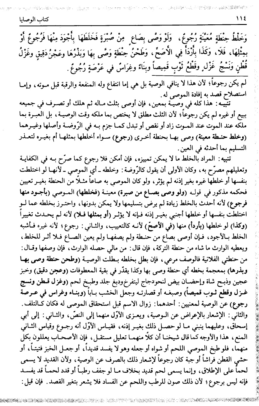 (وَخَلْطُ حِنْطَةٍ مُعَيَّنَةٍ) وَصَّى بِهَا بِحِنْطَةٍ أُخْرَى (رُجُوعٌ) سَوَاءٌ أَخَلَطَهَا بِمِثْلِهَا أَمْ بِغَيْرِهِ لِتَعَذُّرِ التَّسْلِيمِ بِمَا أَحْدَثَهُ فِي الْعَيْنِ.