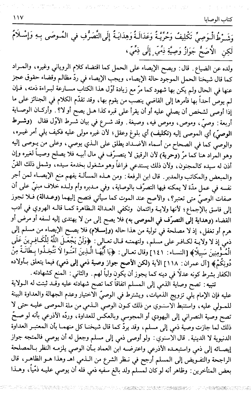 (وَإِسْلَامٌ) فَلَا يَصِحُّ الْإِيصَاءُ مِنْ مُسْلِمٍ إلَى ذِمِّيٍّ إذْ لَا وِلَايَةَ لِكَافِرٍ عَلَى مُسْلِمٍ، وَلِتُهْمَتِهِ قَالَ - تَعَالَى -: {وَلَنْ يَجْعَلَ اللَّهُ لِلْكَافِرِينَ عَلَى الْمُؤْمِنِينَ سَبِيلا} [النساء: 141] [النِّسَاءَ] وَقَالَ - تَعَالَى -: {يَا أَيُّهَا الَّذِينَ آمَنُوا لا تَتَّخِذُوا بِطَانَةً مِنْ دُونِكُمْ} [آل عمران: 118] الْآيَةُ.