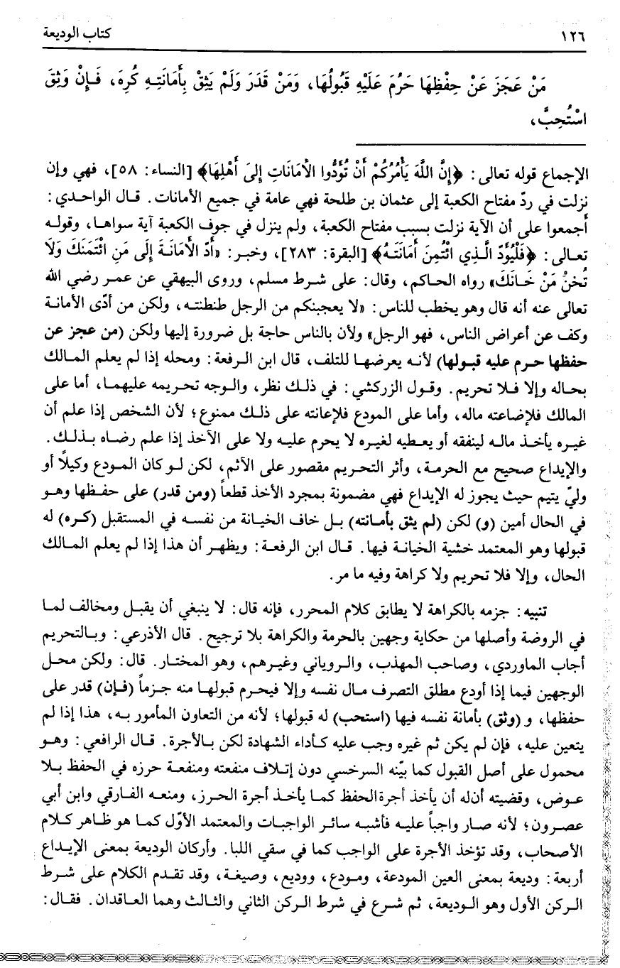 ـــــــــــــــــــــــــــــQالْإِجْمَاعِ قَوْله تَعَالَى: {إِنَّ اللَّهَ يَأْمُرُكُمْ أَنْ تُؤَدُّوا الأَمَانَاتِ إِلَى أَهْلِهَا} [النساء: 58] ، فَهِيَ وَإِنْ نَزَلَتْ فِي رَدِّ مِفْتَاحِ الْكَعْبَةِ إلَى عُثْمَانَ بْنِ طَلْحَةَ فَهِيَ عَامَّةٌ فِي جَمِيعِ الْأَمَانَاتِ. قَالَ الْوَاحِدِيُّ: أَجْمَعُوا عَلَى أَنَّ الْآيَةَ نَزَلَتْ بِسَبَبِ مِفْتَاحِ الْكَعْبَةِ، وَلَمْ يَنْزِلْ فِي جَوْفِ الْكَعْبَةِ آيَةٌ سِوَاهَا، وقَوْله تَعَالَى: {فَلْيُؤَدِّ الَّذِي اؤْتُمِنَ أَمَانَتَهُ} [البقرة: 283] ، وَخَبَرُ: «أَدِّ الْأَمَانَةَ إلَى مَنْ ائْتَمَنَكَ وَلَا تَخُنْ مَنْ خَانَكَ» رَوَاهُ الْحَاكِمُ، وَقَالَ: عَلَى شَرْطِ مُسْلِمٍ، وَرَوَى الْبَيْهَقِيُّ عَنْ عُمَرَ - رَضِيَ اللَّهُ تَعَالَى عَنْهُ - أَنَّهُ قَالَ وَهُوَ يَخْطُبُ لِلنَّاسِ: " لَا يُعْجِبَنَّكُمْ مِنْ الرَّجُلِ طَنْطَنَتُهُ، وَلَكِنْ مَنْ أَدَّى الْأَمَانَةَ وَكَفَّ عَنْ أَعْرَاضِ النَّاس، فَهُوَ الرَّجُلُ " وَلِأَنَّ بِالنَّاسِ حَاجَةً بَلْ ضَرُورَةً إلَيْهَا.