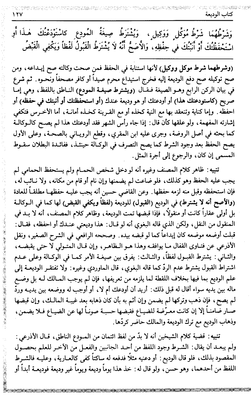ـــــــــــــــــــــــــــــQ (وَشَرْطُهُمَا شَرْطُ مُوَكَّلٍ وَوَكِيلٍ) لِأَنَّهَا اسْتِنَابَةٌ فِي الْحِفْظِ فَمَنْ صَحَّتْ وَكَالَتُهُ صَحَّ إيدَاعُهُ، وَمَنْ صَحَّ تَوْكِيلُهُ صَحَّ دَفْعُ الْوَدِيعَةِ إلَيْهِ فَخَرَجَ اسْتِيدَاعُ مُحْرِمٍ صَيْدًا أَوْ كَافِرٍ مُصْحَفًا وَنَحْوُهُ.