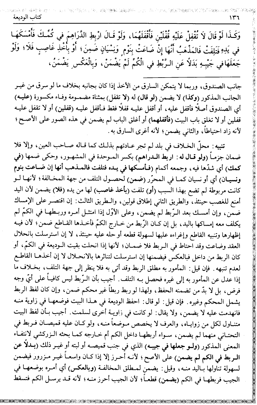 أُجِيبَ بِأَنَّ الرَّبْطَ لَيْسَ كَافِيًا عَلَى أَيِّ وَجْهٍ فُرِضَ، بَلْ لَا بُدَّ مِنْ تَضَمُّنِهِ الْحِفْظَ، وَلِهَذَا لَوْ رَبَطَ رَبْطًا غَيْرَ مُحْكَمٍ ضَمِنَ، وَإِنْ كَانَ لَفْظُ الرَّبْطِ يَشْمَلُ الْمُحْكَمَ وَغَيْرَهُ. فَإِنْ قِيلَ: لَوْ قَالَ: احْفَظْ الْوَدِيعَةَ فِي هَذَا الْبَيْتِ فَوَضَعَهَا فِي زَاوِيَةٍ مِنْهُ فَانْهَدَمَتْ عَلَيْهِ لَا يَضْمَنُ، وَلَا يُقَالُ: لَوْ كَانَتْ فِي زَاوِيَةٍ أُخْرَى لَسَلِمَتْ.
