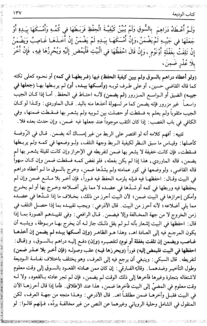 تَنْبِيهٌ: أَفْهَمَ كَلَامُهُ أَنَّهُ لَوْ اقْتَصَرَ عَلَى الرَّبْطِ مِنْ غَيْرِ إمْسَاكٍ أَنَّهُ يَضْمَنُ. قَالَ فِي الرَّوْضَةِ كَأَصْلِهَا: وَقِيَاسُ مَا سَبَقَ النَّظَرُ لِكَيْفِيَّةِ الرَّبْطِ وَجِهَةِ التَّلَفِ، وَلَوْ وَضَعَهَا فِي كُمِّهِ وَلَمْ يَرْبِطْهَا فَسَقَطَتْ، فَإِنْ كَانَتْ خَفِيفَةً لَا يَشْعُرُ بِهَا ضَمِنَ لِتَفْرِيطِهِ فِي الْإِحْرَازِ وَإِنْ كَانَتْ ثَقِيلَةً يَشْعُرُ بِهَا لَمْ يَضْمَنْ، قَالَهُ الْمَاوَرْدِيُّ، هَذَا إذَا لَمْ يَكُنْ بِفِعْلِهِ، فَلَوْ نَفَضَ كُمَّهُ فَسَقَطَتْ ضَمِنَ وَإِنْ كَانَ سَهْوًا قَالَهُ الْقَاضِي، وَلَوْ وَضَعَهَا فِي كَوْرِ عِمَامَتِهِ وَلَمْ يَشُدَّهَا ضَمِنَ، وَخَرَجَ بِالسُّوقِ مَا لَوْ أَعْطَاهُ دَرَاهِمَ فِي الْبَيْتِ وَقَالَ: احْفَظْهَا فِيهِ فَإِنَّهُ يَلْزَمُهُ الْحِفْظُ فِيهِ فَوْرًا، فَإِنْ أَخَّرَ بَلَا مَانِعٍ ضَمِنَ وَإِنْ لَمْ يَحْفَظْهَا فِيهِ وَرَبَطَهَا فِي كُمِّهِ أَوْ شَدَّهَا فِي عَضُدِهِ لَا مِمَّا يَلِي أَضْلَاعَهُ وَخَرَجَ بِهَا أَوْ لَمْ يَخْرُجْ وَأَمْكَنَ إحْرَازُهَا فِي الْبَيْتِ ضَمِنَ؛ لِأَنَّ الْبَيْتَ أَحْرَزَ مِنْ ذَلِكَ، بِخِلَافِ مَا إذَا شَدَّهَا فِي عَضُدِهِ مِمَّا يَلِي أَضْلَاعَهُ؛ لِأَنَّهُ أَحْرَزُ مِنْ الْبَيْتِ.