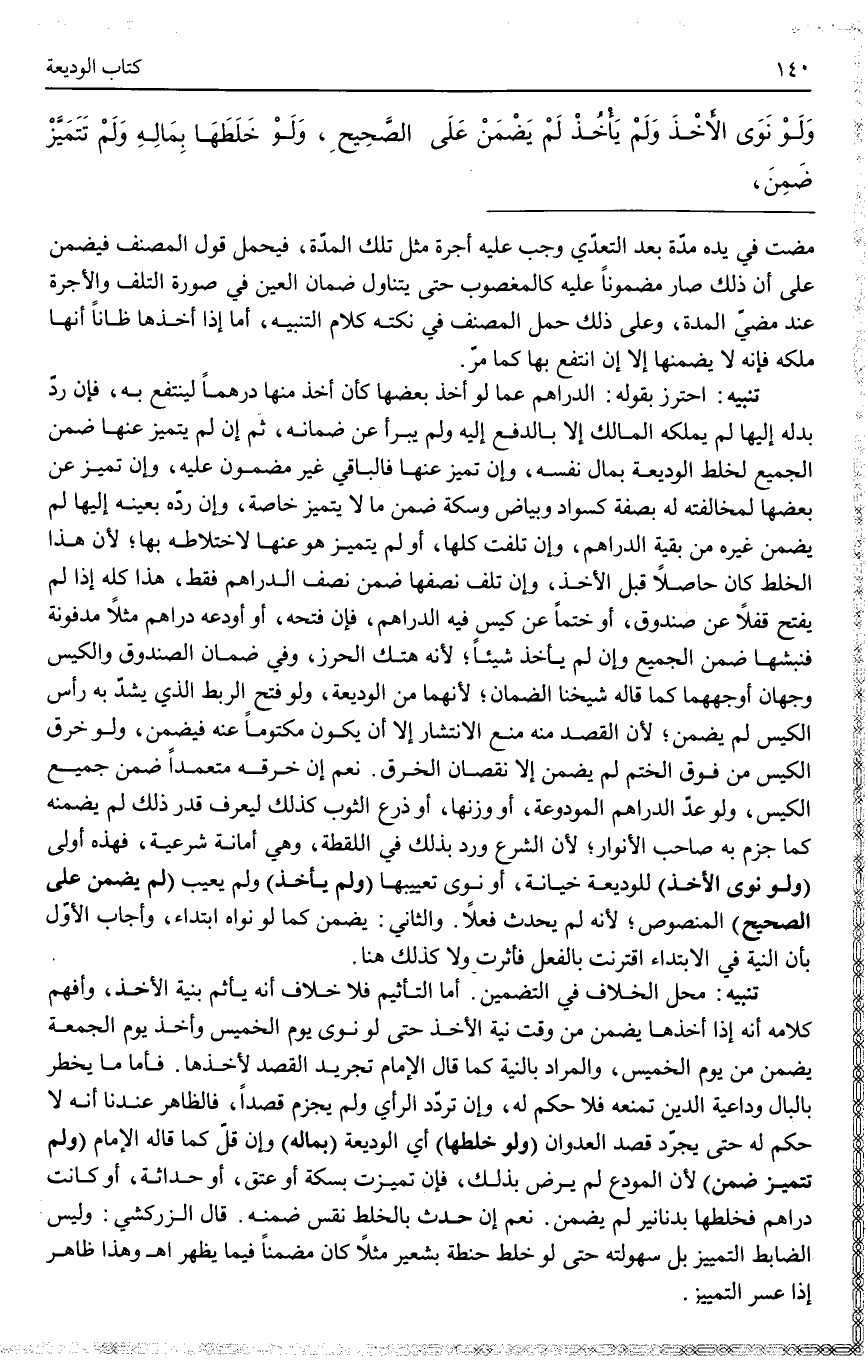 (وَلَوْ خَلَطَهَا) أَيْ الْوَدِيعَةَ (بِمَالِهِ) وَإِنْ قَلَّ كَمَا قَالَ الْإِمَامُ (وَلَمْ تَتَمَيَّزْ ضَمِنَ) لِأَنَّ الْمُودِعَ لَمْ يَرْضَ بِذَلِكَ، فَإِنْ تَمَيَّزَتْ بِسِكَّةٍ أَوْ عِتْقٍ، أَوْ حَدَاثَةٍ، أَوْ كَانَتْ دَرَاهِمَ فَخَلَطَهَا بِدَنَانِيرَ لَمْ يَضْمَنْ. نَعَمْ إنْ حَدَثَ بِالْخَلْطِ نَقْصٌ ضَمِنَهُ. قَالَ الزَّرْكَشِيُّ: وَلَيْسَ الضَّابِطُ التَّمْيِيزَ بَلْ سُهُولَتَهُ حَتَّى لَوْ خَلَطَ حِنْطَةً بِشَعِيرٍ مَثَلًا كَانَ مُضَمَّنًا فِيمَا يَظْهَرُ اهـ.