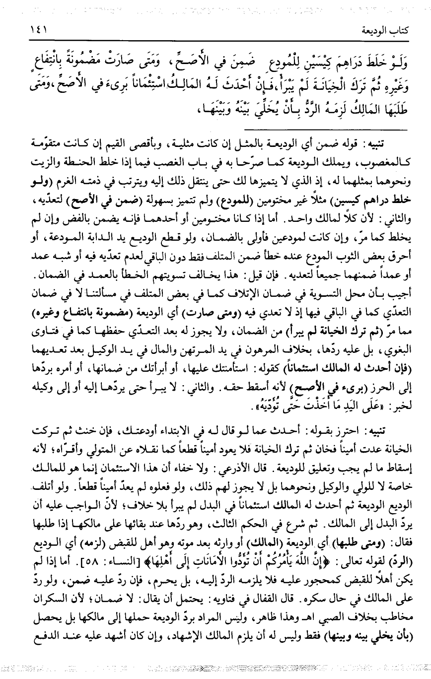 ثُمَّ شَرَعَ فِي الْحُكْمِ الثَّالِثِ، وَهُوَ رَدُّهَا عِنْدَ بَقَائِهَا عَلَى مَالِكِهَا إذَا طَلَبَهَا فَقَالَ: (وَمَتَى طَلَبَهَا) أَيْ الْوَدِيعَةَ (الْمَالِكُ) أَوْ وَارِثُهُ بَعْدَ مَوْتِهِ وَهُوَ أَهْلٌ لِلْقَبْضِ (لَزِمَهُ) أَيْ الْوَدِيعَ (الرَّدُّ) لِقَوْلِهِ تَعَالَى: {إِنَّ اللَّهَ يَأْمُرُكُمْ أَنْ تُؤَدُّوا الأَمَانَاتِ إِلَى أَهْلِهَا} [النساء: 58] [النِّسَاءَ] . أَمَّا إذَا لَمْ يَكُنْ أَهْلًا لِلْقَبْضِ كَمَحْجُورٍ عَلَيْهِ فَلَا يَلْزَمُهُ الرَّدُّ إلَيْهِ، بَلْ يَحْرُمُ، فَإِنْ رَدَّ عَلَيْهِ ضَمِنَ، وَلَوْ رَدَّ عَلَى الْمَالِكِ فِي حَالِ سُكْرِهِ. قَالَ الْقَفَّالُ فِي فَتَاوِيهِ: يَحْتَمِلُ أَنْ يُقَالَ: لَا ضَمَانَ؛ لِأَنَّ السَّكْرَانَ مُخَاطَبٌ بِخِلَافِ الصَّبِيِّ اهـ.