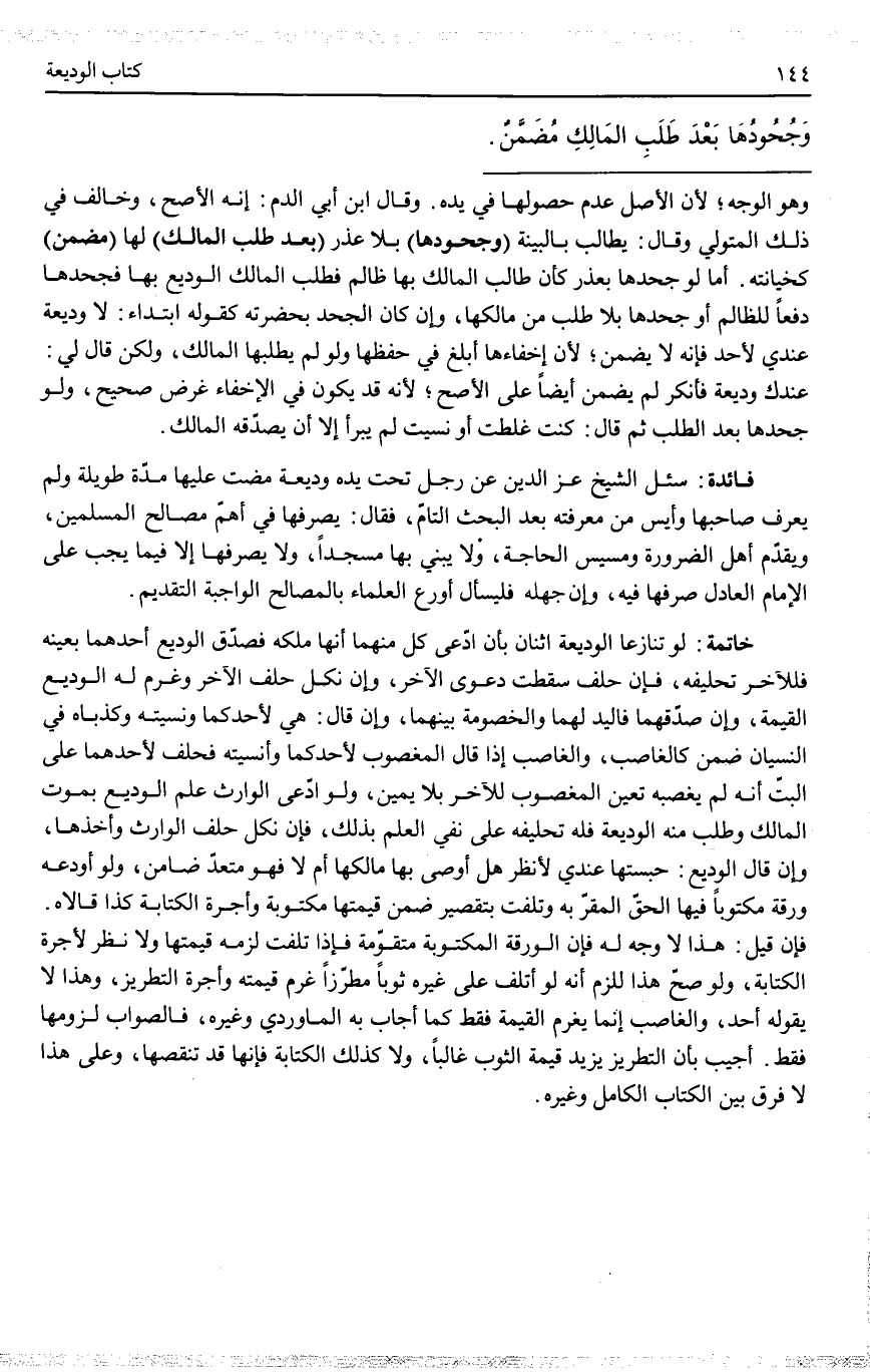 ـــــــــــــــــــــــــــــQوَهُوَ الْوَجْهُ؛ لِأَنَّ الْأَصْلَ عَدَمُ حُصُولِهَا فِي يَدِهِ. وَقَالَ ابْنُ أَبِي الدَّمِ: إنَّهُ الْأَصَحُّ، وَخَالَفَ فِي ذَلِكَ الْمُتَوَلِّي وَقَالَ: يُطَالَبُ بِالْبَيِّنَةِ (وَجُحُودُهَا) بِلَا عُذْرٍ (بَعْدَ طَلَبِ الْمَالِكِ) لَهَا (مُضَمَّنٌ) كَخِيَانَتِهِ. أَمَّا لَوْ جَحَدَهَا بِعُذْرٍ كَأَنْ طَالَبَ الْمَالِكَ بِهَا ظَالِمٌ فَطَلَبَ الْمَالِكُ الْوَدِيعَ بِهَا فَجَحَدَهَا دَفْعًا لِلظَّالِمِ أَوْ جَحَدَهَا بِلَا طَلَبٍ مِنْ مَالِكِهَا، وَإِنْ كَانَ الْجَحْدُ بِحَضْرَتِهِ كَقَوْلِهِ ابْتِدَاءً: لَا وَدِيعَةَ عِنْدِي لِأَحَدٍ فَإِنَّهُ لَا يَضْمَنُ؛ لِأَنَّ إخْفَاءَهَا أَبْلَغُ فِي حِفْظِهَا وَلَوْ لَمْ يَطْلُبْهَا الْمَالِكُ، وَلَكِنْ قَالَ لِي: عِنْدَك وَدِيعَةٌ فَأَنْكَرَ لَمْ يَضْمَنْ أَيْضًا عَلَى الْأَصَحِّ؛ لِأَنَّهُ قَدْ يَكُونُ فِي الْإِخْفَاءِ غَرَضٌ صَحِيحٌ، وَلَوْ جَحَدَهَا بَعْدَ الطَّلَبِ ثُمَّ قَالَ: كُنْتُ غَلِطْتُ أَوْ نَسِيتُ لَمْ يَبْرَأْ إلَّا أَنْ يُصَدِّقَهُ الْمَالِكُ.