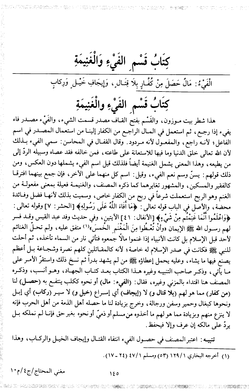 كِتَابُ قَسْمِ الْفَيْءِ وَالْغَنِيمَةِ الْفَيْءُ: مَالٌ حَصَلَ مِنْ كُفَّارٍ بَلَا قِتَالٍ وَإِيجَافِ خَيْلٍ وَرِكَابٍ