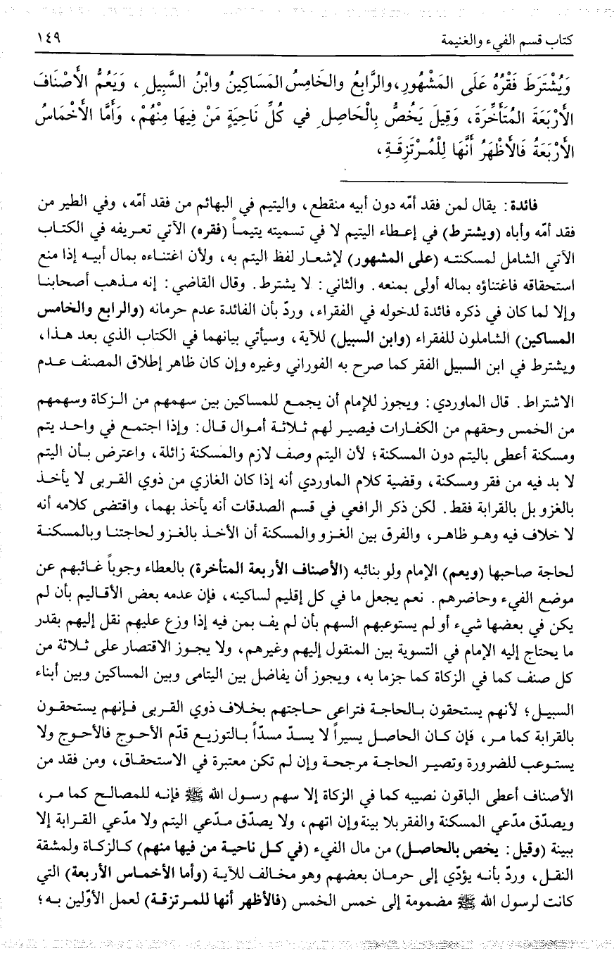 ـــــــــــــــــــــــــــــQفَائِدَةٌ: يُقَالُ لِمَنْ فَقَدَ أُمَّهُ دُونَ أَبِيهِ مُنْقَطِعٌ، وَالْيَتِيمُ فِي الْبَهَائِمِ مَنْ فَقَدَ أُمَّهُ، وَفِي الطَّيْرِ مَنْ فَقَدَ أُمَّهُ وَأَبَاهُ (وَيُشْتَرَطُ) فِي إعْطَاءِ الْيَتِيمِ لَا فِي تَسْمِيَتِهِ يَتِيمًا (فَقْرُهُ) الْآتِي تَعْرِيفُهُ فِي الْكِتَابِ الْآتِي الشَّامِلُ لِمَسْكَنَتِهِ (عَلَى الْمَشْهُورِ) لِإِشْعَارِ لَفْظِ الْيُتْمِ بِهِ، وَلِأَنَّ اغْتِنَاءَهُ بِمَالِ أَبِيهِ إذَا مُنِعَ اسْتِحْقَاقُهُ فَاغْتِنَاؤُهُ بِمَالِهِ أَوْلَى بِمَنْعِهِ. وَالثَّانِي: لَا يُشْتَرَطُ. وَقَالَ الْقَاضِي: إنَّهُ مَذْهَبُ أَصْحَابِنَا وَإِلَّا لَمَا كَانَ فِي ذِكْرِهِ فَائِدَةٌ لِدُخُولِهِ فِي الْفُقَرَاءِ، وَرُدَّ بِأَنَّ الْفَائِدَةَ عَدَمُ حِرْمَانِهِ (وَالرَّابِعُ وَالْخَامِسُ الْمَسَاكِينُ) الشَّامِلُونَ لِلْفُقَرَاءِ (وَابْنُ السَّبِيلِ) لِلْآيَةِ، وَسَيَأْتِي بَيَانُهُمَا فِي الْكِتَابِ الَّذِي بَعْدَ هَذَا، وَيُشْتَرَطُ فِي ابْنِ السَّبِيلِ الْفَقْرُ كَمَا صَرَّحَ بِهِ الْفُورَانِيُّ وَغَيْرُهُ وَإِنْ كَانَ ظَاهِرُ إطْلَاقِ الْمُصَنِّفِ عَدَمَ الِاشْتِرَاطِ. قَالَ الْمَاوَرْدِيُّ: وَيَجُوزُ لِلْإِمَامِ أَنْ يَجْمَعَ لِلْمَسَاكِينِ بَيْنَ سَهْمِهِمْ مِنْ الزَّكَاةِ وَسَهْمِهِمْ مِنْ الْخُمْسِ وَحَقِّهِمْ مِنْ الْكَفَّارَاتِ فَيَصِيرُ لَهُمْ ثَلَاثَةُ أَمْوَالٍ قَالَ: وَإِذَا اجْتَمَعَ فِي وَاحِدٍ يُتْمٌ وَمَسْكَنَةٌ أُعْطِيَ بِالْيُتْمِ دُونَ الْمَسْكَنَةِ؛ لِأَنَّ الْيُتْمَ وَصْفٌ لَازِمٌ وَالْمَسْكَنَةَ زَائِلَةٌ، وَاعْتُرِضَ بِأَنَّ الْيُتْمَ لَا بُدَّ فِيهِ مِنْ فَقْرٍ وَمَسْكَنَةٍ، وَقَضِيَّةُ كَلَامِ الْمَاوَرْدِيُّ أَنَّهُ إذَا كَانَ الْغَازِي مِنْ ذَوِي الْقُرْبَى لَا يَأْخُذَ بِالْغَزْوِ بَلْ بِالْقَرَابَةِ فَقَطْ. لَكِنْ ذَكَرَ الرَّافِعِيُّ فِي قَسْمِ الصَّدَقَاتِ أَنَّهُ يَأْخُذَ بِهِمَا، وَاقْتَضَى كَلَامُهُ أَنَّهُ لَا خِلَافَ فِيهِ وَهُوَ ظَاهِرٌ، وَالْفَرْقُ بَيْنَ الْغَزْوِ وَالْمَسْكَنَةِ أَنَّ الْأَخْذَ بِالْغَزْوِ لِحَاجَتِنَا وَبِالْمَسْكَنَةِ لِحَاجَةِ صَاحِبِهَا (وَيَعُمُّ) الْإِمَامُ وَلَوْ بِنَائِبِهِ (الْأَصْنَافَ الْأَرْبَعَةَ الْمُتَأَخِّرَةَ) بِالْعَطَاءِ وُجُوبًا غَائِبُهُمْ عَنْ مَوْضِعِ الْفَيْءِ وَحَاضِرُهُمْ.