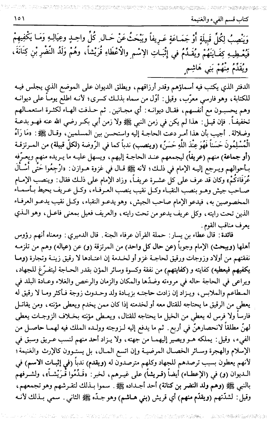 وَيُنَصِّبُ لِكُلِّ قَبِيلَةٍ أَوْ جَمَاعَةٍ عَرِيفًا وَيَبْحَثُ عَنْ حَالِ كُلِّ وَاحِدٍ وَعِيَالِهِ وَمَا يَكْفِيهِمْ فَيُعْطِيهِ كِفَايَتَهُمْ وَيُقَدِّمُ فِي إثْبَاتِ الِاسْمِ وَالْإِعْطَاءِ قُرَيْشًا، وَهُمْ وَلَدُ النَّضْرِ بْنِ كِنَانَةَ، وَيُقَدِّمُ مِنْهُمْ بَنِي هَاشِمٍ