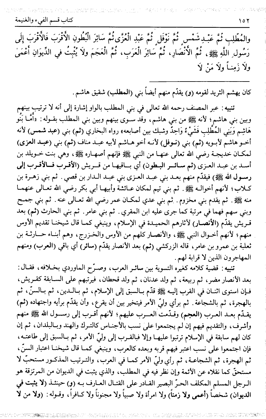 تَنْبِيهٌ: عَبَّرَ الْمُصَنِّفُ - رَحِمَهُ اللَّهُ تَعَالَى - فِي بَنِي الْمُطَّلِبِ بِالْوَاوِ إشَارَةً إلَى أَنَّهُ لَا تَرْتِيبَ بَيْنَهُمْ وَبَيْنَ بَنِي هَاشِمٍ؛ لِأَنَّهُ - صَلَّى اللَّهُ عَلَيْهِ وَسَلَّمَ - مِنْ بَنِي هَاشِمٍ، وَقَدْ سَوَّى بَيْنَهُمْ وَبَيْنَ بَنِي الْمُطَّلِبِ بِقَوْلِهِ: «إنَّمَا بَنُو هَاشِمٍ وَبَنُو الْمُطَّلِبِ شَيْءٌ وَاحِدٌ وَشَبَّكَ بَيْنَ أَصَابِعِهِ» رَوَاهُ الْبُخَارِيُّ (ثُمَّ) بَنِي (عَبْدِ شَمْسٍ) لِأَنَّهُ أَخُو هَاشِمٍ لِأَبَوَيْهِ (ثُمَّ) بَنِي (نَوْفَلٍ) لِأَنَّهُ أَخُو هَاشِمٍ لِأَبِيهِ عَبْدِ مُنَافٍ (ثُمَّ) بَنِي (عَبْدِ الْعُزَّى) لِمَكَانِ خَدِيجَةَ - رَضِيَ اللَّهُ تَعَالَى عَنْهَا - مِنْ النَّبِيِّ - صَلَّى اللَّهُ عَلَيْهِ وَسَلَّمَ - فَإِنَّهُمْ أَصْهَارُهُ - صَلَّى اللَّهُ عَلَيْهِ وَسَلَّمَ - وَهِيَ بِنْتُ خُوَيْلِدِ بْنِ أَسَدِ بْنِ عَبْدِ الْعُزَّى (ثُمَّ سَائِرَ الْبُطُونِ) أَيْ بَاقِيهَا مِنْ قُرَيْشٍ (الْأَقْرَبَ فَالْأَقْرَبَ إلَى رَسُولِ اللَّهِ - صَلَّى اللَّهُ عَلَيْهِ وَسَلَّمَ -) . فَيُقَدِّمُ مِنْهُمْ بَعْدَ بَنِي عَبْدِ الْعُزَّى بَنِي عَبْدِ الدَّارِ بْنِ قُصَيٍّ. ثُمَّ بَنِي زُهْرَةَ بْنِ كِلَابٍ؛ لِأَنَّهُمْ أَخْوَالُهُ - صَلَّى اللَّهُ عَلَيْهِ وَسَلَّمَ -. ثُمَّ بَنِي تَيْمٍ لِمَكَانِ عَائِشَةَ وَأَبِيهَا أَبِي بَكْرٍ - رَضِيَ اللَّهُ تَعَالَى عَنْهُمَا - مِنْهُ - صَلَّى اللَّهُ عَلَيْهِ وَسَلَّمَ -. ثُمَّ يُقَدِّمُ بَنِي مَخْزُومٍ. ثُمَّ بَنِي عَدِيٍّ لِمَكَانِ عُمَرَ - رَضِيَ اللَّهُ تَعَالَى عَنْهُ -. ثُمَّ بَنِي جُمَحٍ وَبَنِي سَهْمٍ فَهُمَا فِي مَرْتَبَةٍ كَمَا جَرَى عَلَيْهِ ابْنُ الْمُقْرِي. ثُمَّ بَنِي عَامِرٍ. ثُمَّ بَنِي الْحَارِثِ (ثُمَّ) بَعْدَ قُرَيْشٍ يُقَدِّمُ (الْأَنْصَارَ) لِآثَارِهِمْ الْحَمِيدَةِ فِي الْإِسْلَامِ، وَيَنْبَغِي كَمَا قَالَ شَيْخُنَا تَقْدِيمُ الْأَوْسِ مِنْهُمْ؛ لِأَنَّهُمْ أَخْوَالُ النَّبِيِّ - صَلَّى اللَّهُ عَلَيْهِ وَسَلَّمَ - وَالْأَنْصَارُ كُلُّهُمْ مِنْ الْأَوْسِ وَالْخَزْرَجِ، وَهُمْ أَبْنَاءُ حَارِثَةَ بْنِ ثَعْلَبَةَ بْنِ عَمْرِو بْنِ عَامِرٍ، قَالَ الزَّرْكَشِيُّ (ثُمَّ) بَعْدَ الْأَنْصَارِ يُقَدِّمُ (سَائِرَ) أَيْ بَاقِيَ (الْعَرَبِ) وَمِنْهُمْ الْمُهَاجِرُونَ الَّذِينَ لَا قَرَابَةَ لَهُمْ.