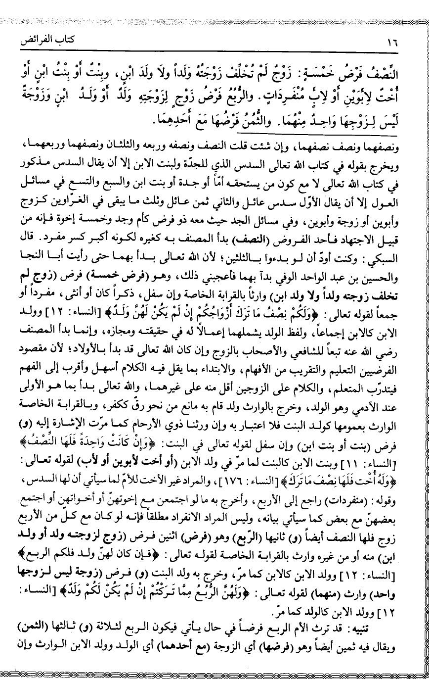 النِّصْفُ فَرْضُ خَمْسَةٍ: زَوْجٍ لَمْ تُخَلِّفْ زَوْجَتُهُ وَلَدًا وَلَا وَلَدَ ابْنٍ، وَبِنْتٍ أَوْ بِنْتِ ابْنٍ أَوْ أُخْتٍ لِأَبَوَيْنِ أَوْ لِأَبٍ مُنْفَرِدَاتٍ.