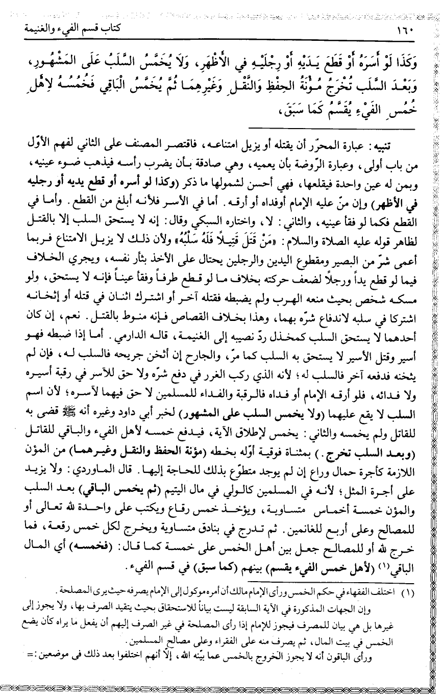 (وَلَا يُخَمَّسُ السَّلَبُ عَلَى الْمَشْهُورِ) لِخَبَرِ أَبِي دَاوُد وَغَيْرِهِ «أَنَّهُ - صَلَّى اللَّهُ عَلَيْهِ وَسَلَّمَ - قَضَى بِهِ لِلْقَاتِلِ وَلَمْ يُخَمِّسْهُ» وَالثَّانِي: يُخَمَّسُ لِإِطْلَاقِ الْآيَةِ، فَيَدْفَعَ خُمُسَهُ لِأَهْلِ الْفَيْءِ وَالْبَاقِيَ لِلْقَاتِلِ.