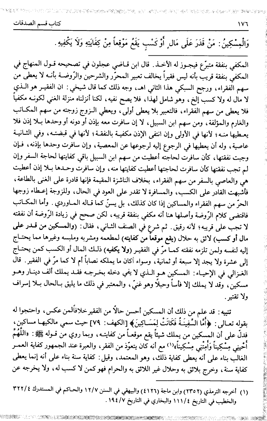 تَنْبِيهٌ قَدْ عُلِمَ مِنْ ذَلِكَ أَنَّ الْمِسْكِينَ أَحْسَنُ حَالًا مِنْ الْفَقِيرِ خِلَافًا لِمَنْ عَكَسَ، وَاحْتَجُّوا لَهُ بِقَوْلِهِ - تَعَالَى -: {أَمَّا السَّفِينَةُ فَكَانَتْ لِمَسَاكِينَ} [الكهف: 79] [الْكَهْفُ] حَيْثُ سُمِّيَ مَالِكِيهَا مَسَاكِينَ، فَدَلَّ عَلَى أَنَّ الْمِسْكِينَ مَنْ يَمْلِكُ شَيْئًا يَقَعُ مَوْقِعًا مِنْ كِفَايَتِهِ، وَبِمَا رُوِيَ مِنْ قَوْلِهِ «- صَلَّى اللَّهُ عَلَيْهِ وَسَلَّمَ -: اللَّهُمَّ أَحْيِنِي مِسْكِينًا وَأَمِتْنِي مِسْكِينًا» مَعَ أَنَّهُ كَانَ يَتَعَوَّذُ مِنْ الْفَقْرِ، وَالْعِبْرَةُ عِنْدَ الْجُمْهُورِ كِفَايَةُ الْعُمْرِ الْغَالِبِ بِنَاءً عَلَى أَنَّهُ يُعْطَى كِفَايَةَ ذَلِكَ، وَهُوَ الْمُعْتَمَدُ، وَقِيلَ: كِفَايَةَ سَنَةٍ بِنَاءً عَلَى أَنَّهُ إنَّمَا يُعْطَى كِفَايَةَ سَنَةٍ، وَخَرَجَ بِلَائِقٍ بِهِ وَحَلَالٍ غَيْرُ اللَّائِقِ بِهِ وَالْحَرَامُ فَهُوَ كَمَنْ لَا كَسْبَ لَهُ، وَلَا يُخْرِجُهُ عَنْ