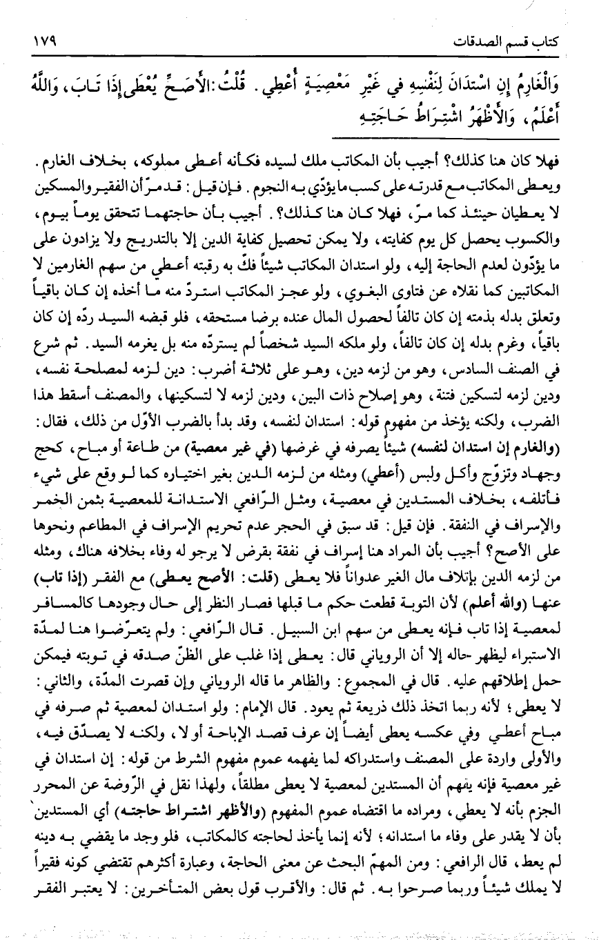 وَالْغَارِمُ إنْ اسْتَدَانَ لِنَفْسِهِ فِي غَيْرِ مَعْصِيَةٍ أُعْطِيَ. قُلْتُ: الْأَصَحُّ يُعْطَى إذَا تَابَ، وَاَللَّهُ أَعْلَمُ، وَالْأَظْهَرُ اشْتِرَاطُ حَاجَتِهِ