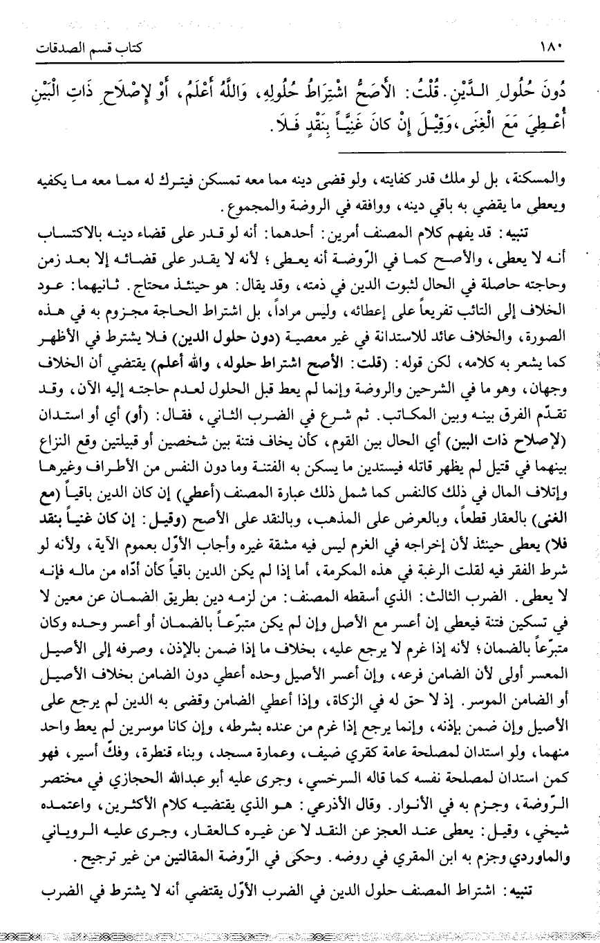 تَنْبِيهٌ اشْتِرَاطُ الْمُصَنِّفِ حُلُولَ الدَّيْنِ فِي الضَّرْبِ الْأَوَّلِ يَقْتَضِي أَنَّهُ لَا يَشْتَرِطُ فِي الضَّرْبِ